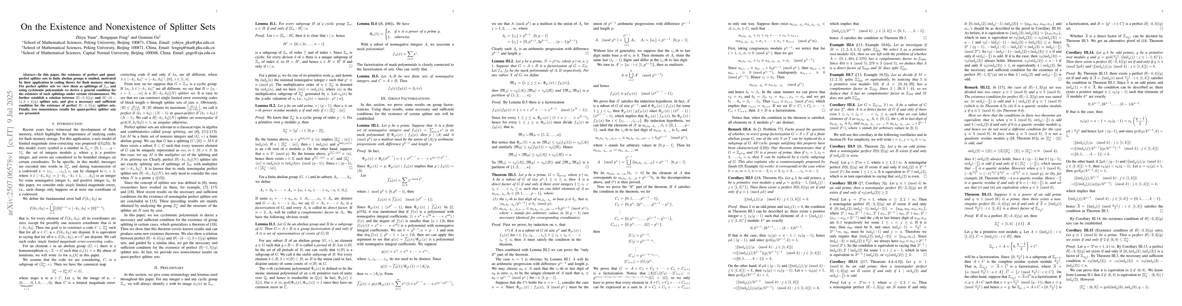In this paper, the existence of perfect and quasi-perfect splitter sets in finite abelian groups is studied, motivated by their application in coding theory for flash memory storage. For perfect splitter sets we view them as splittings of $\mathbb{Z}_n$, and using cyclotomic polynomials we derive a general condition for the existence of such splittings under certain circumstances. We further establish a relation between $B[-k, k](q)$ and $B[-(k-1), k+1](q)$ splitter sets, and give a necessary and sufficient condition for the existence of perfect $B[-1, 5](q)$ splitter sets. Finally, two nonexistence results for quasi-perfect splitter sets are presented.