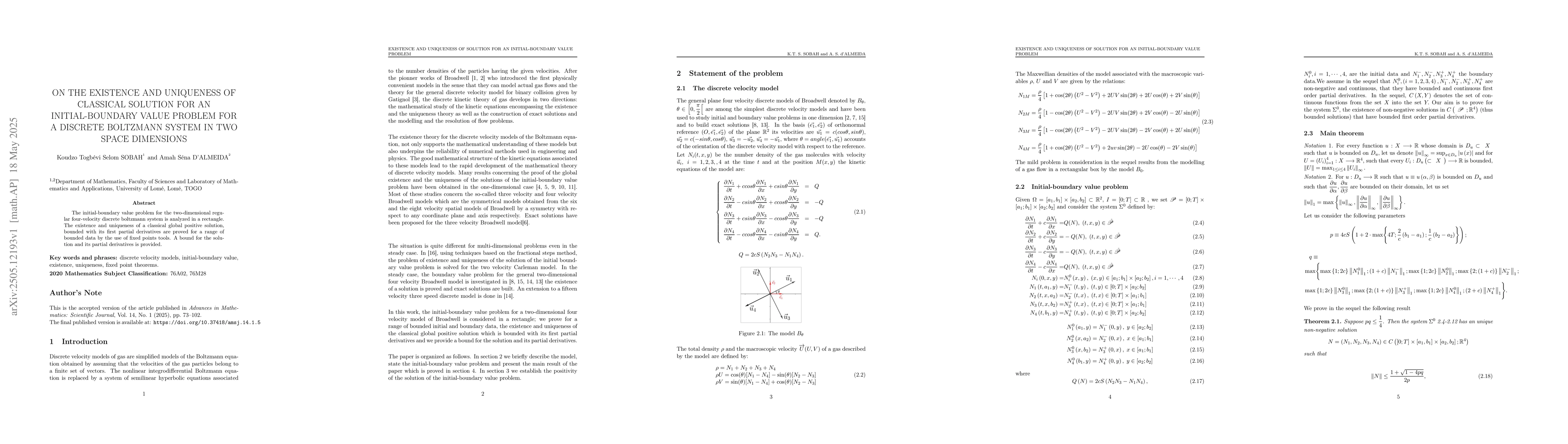 A research paper proves the existence and uniqueness of a global positive solution to an initial-boundary value problem for a discrete Boltzmann system in two dimensions, bounded by fixed point tools.