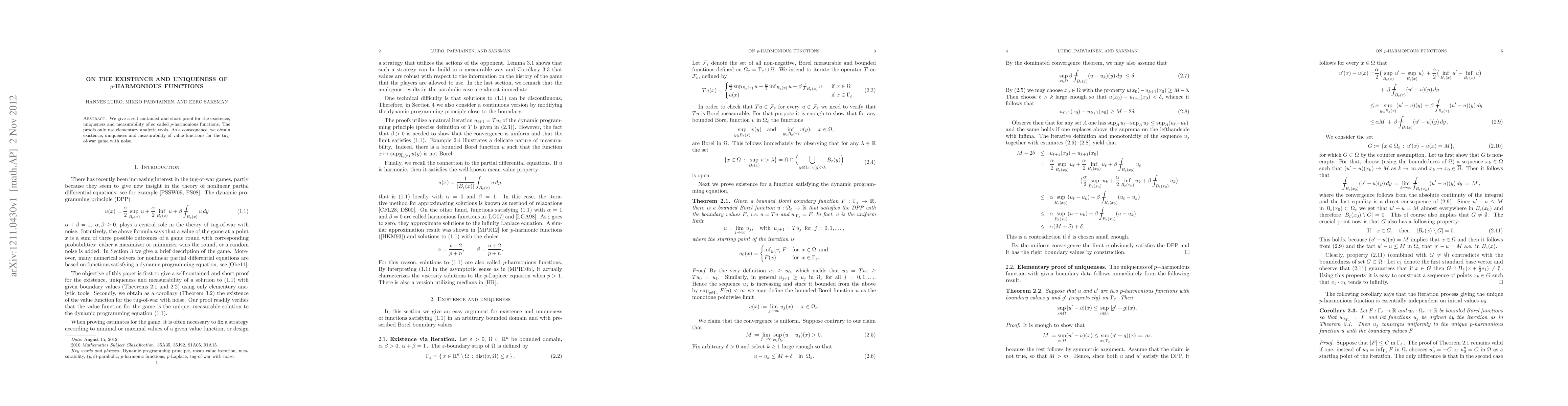 We give a self-contained and short proof for the existence, uniqueness and measurability of so called $p$-harmonious functions. The proofs only use elementary analytic tools. As a consequence, we obtain existence, uniqueness and measurability of value functions for the tug-of-war game with noise.