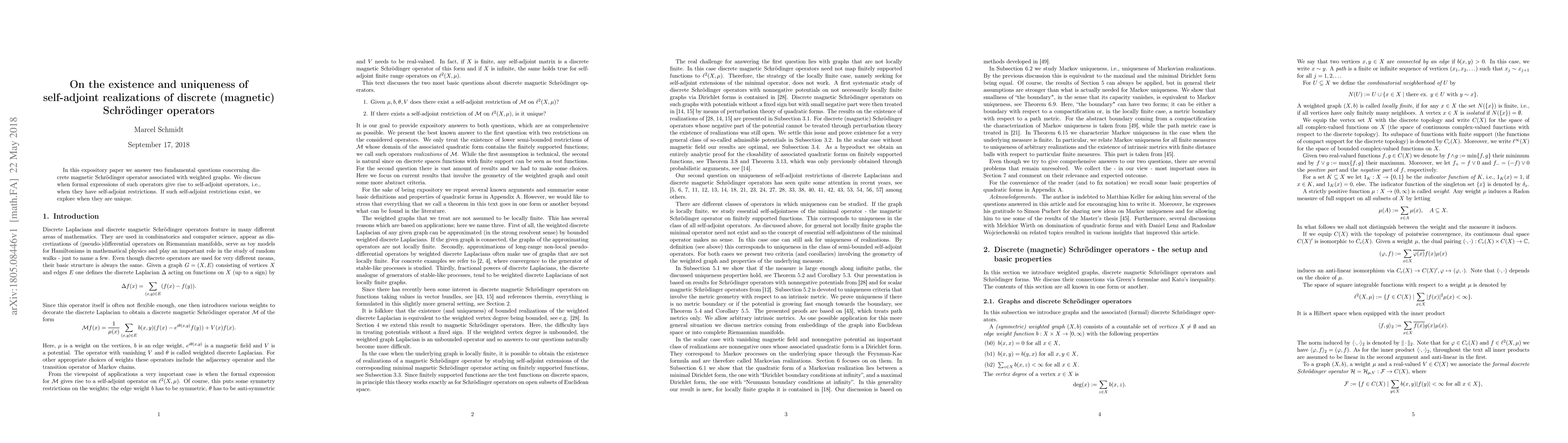 In this expository paper we answer two fundamental questions concerning discrete magnetic Schr\"odinger operator associated with weighted graphs. We discuss when formal expressions of such operators give rise to self-adjoint operators, i.e., when they have self-adjoint restrictions. If such self-adjoint restrictions exist, we explore when they are unique.
