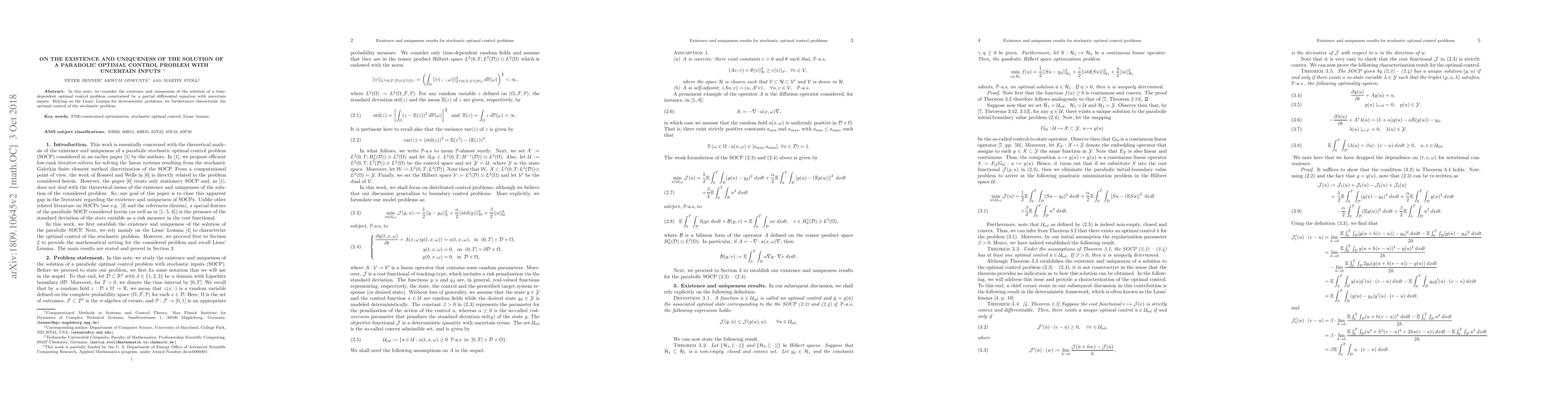This paper investigates the existence and uniqueness of solutions for a time-dependent optimal control problem governed by a partial differential equation with uncertain inputs. It leverages Lions' Lemma to characterize the optimal control in the stochastic setting.
