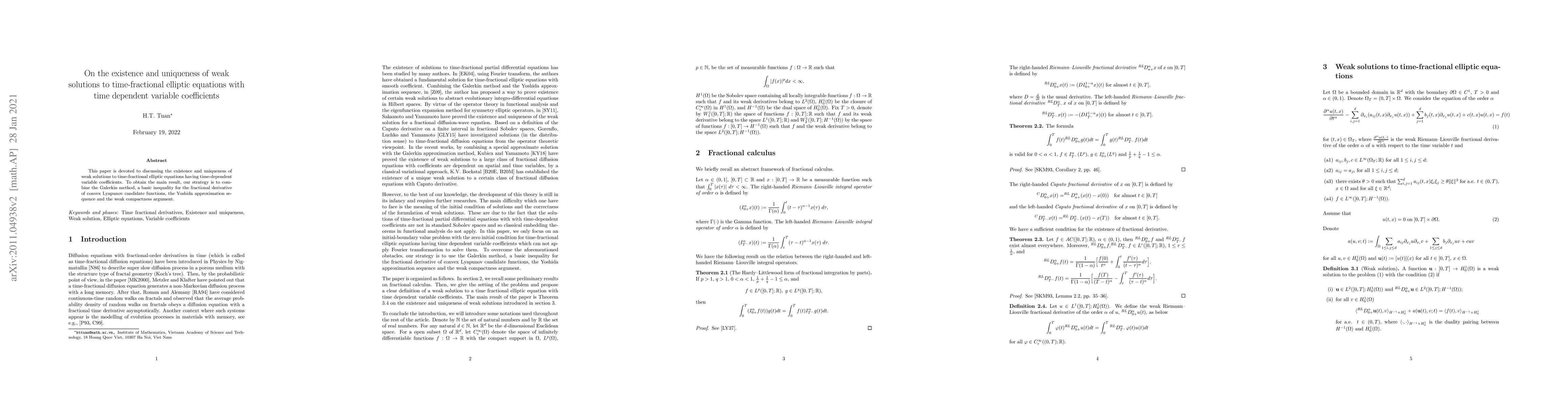 This paper is devoted to discussing the existence and uniqueness of weak solutions to time-fractional elliptic equations having time-dependent variable coefficients. To obtain the main result, our strategy is to combine the Galerkin method, a basic inequality for the fractional derivative of convex Lyapunov candidate functions, the Yoshida approximation sequence and the weak compactness argument.