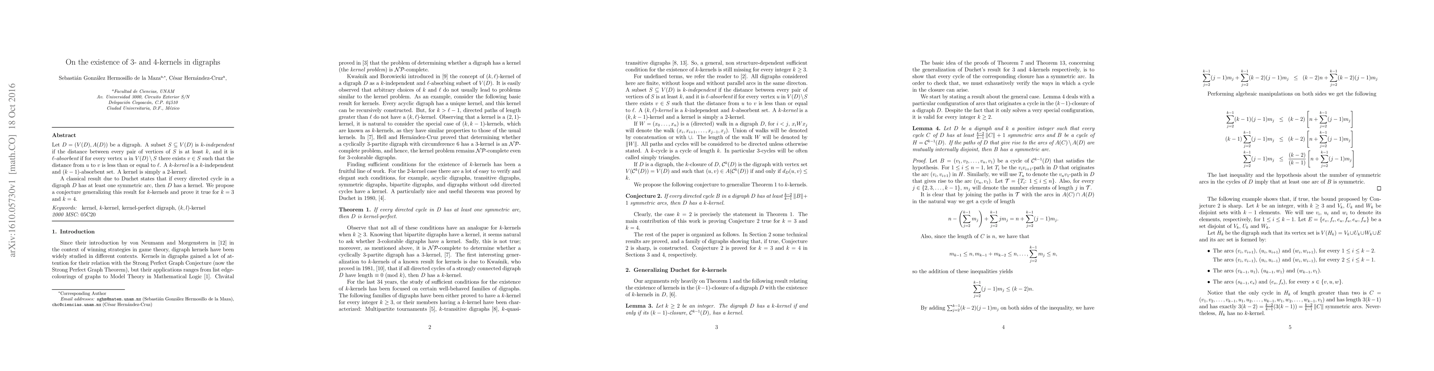 Let $D = (V(D), A(D))$ be a digraph. A subset $S \subseteq V(D)$ is $k$-independent if the distance between every pair of vertices of $S$ is at least $k$, and it is $\ell$-absorbent if for every vertex $u$ in $V(D) \setminus S$ there exists $v \in S$ such that the distance from $u$ to $v$ is less than or equal to $\ell$. A $k$-kernel is a $k$-independent and $(k-1)$-absorbent set. A kernel is simply a $2$-kernel. A classical result due to Duchet states that if every directed cycle in a digraph $D$ has at least one symmetric arc, then $D$ has a kernel. We propose a conjecture generalizing this result for $k$-kernels and prove it true for $k = 3$ and $k = 4$.