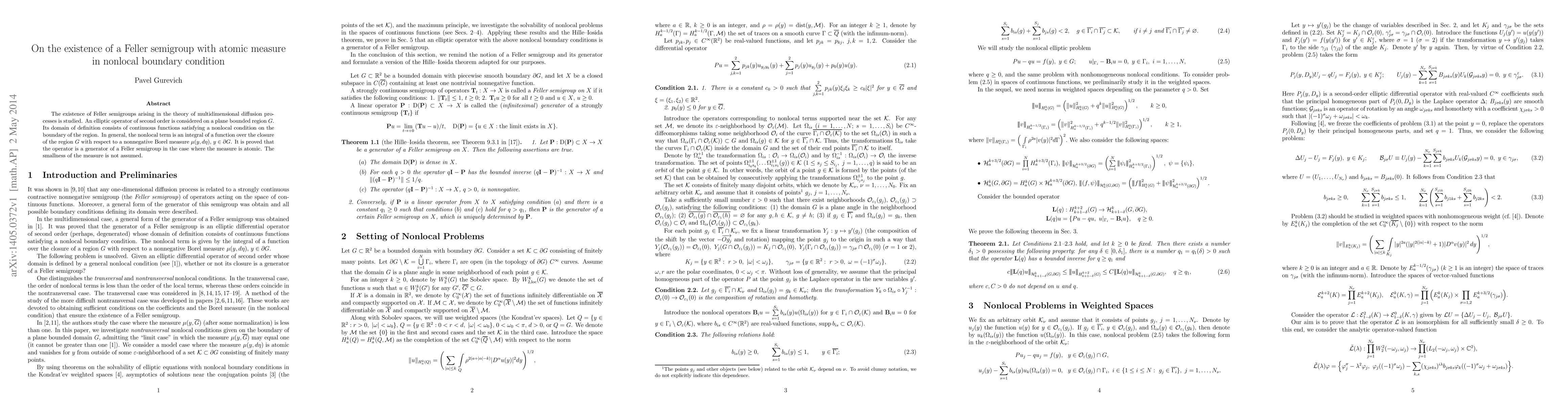 This paper investigates the existence of Feller semigroups in multidimensional diffusion processes, focusing on an elliptic operator defined on a bounded plane region with a nonlocal boundary condition. It proves the operator generates a Feller semigroup when the associated measure is atomic, without requiring the measure to be small.