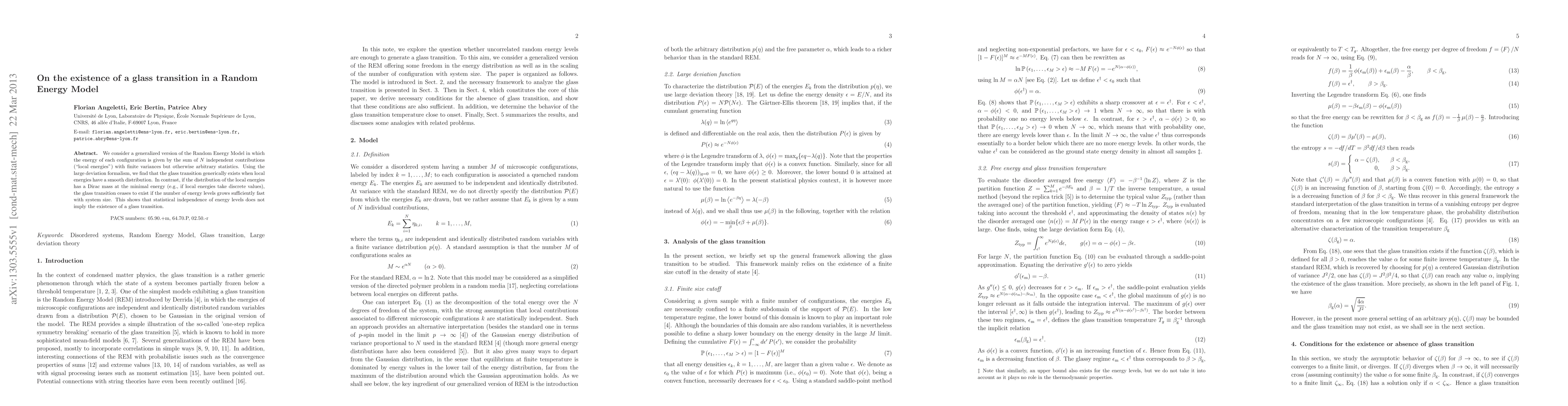 We consider a generalized version of the Random Energy Model in which the energy of each configuration is given by the sum of $N$ independent contributions ("local energies") with finite variances but otherwise arbitrary statistics. Using the large deviation formalism, we find that the glass transition generically exists when local energies have a smooth distribution. In contrast, if the distribution of the local energies has a {Dirac mass} at the minimal energy (e.g., if local energies take discrete values), the glass transition ceases to exist if the number of energy levels grows sufficiently fast with system size. This shows that statistical independence of energy levels does not imply the existence of a glass transition.