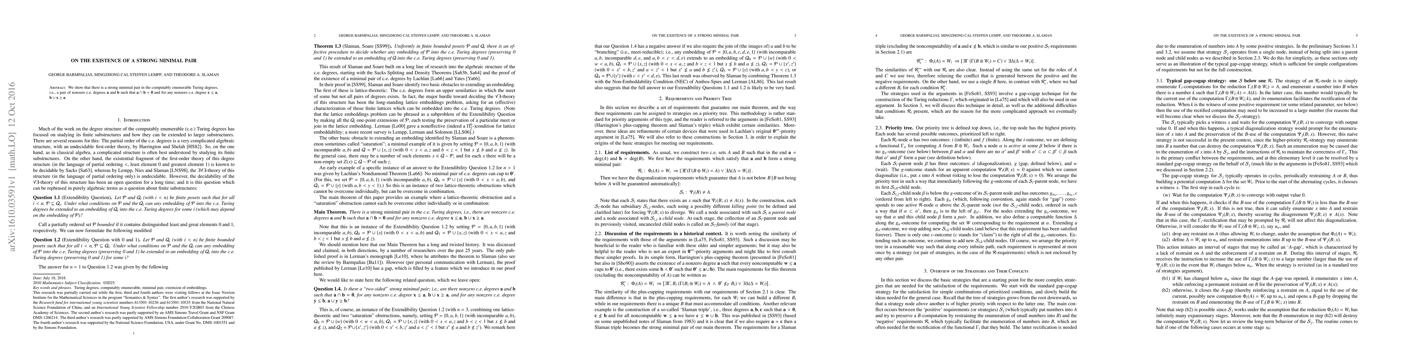 Summary: This paper demonstrates the existence of a strong minimal pair within the computably enumerable Turing degrees, providing significant insight into the structure of these degrees.