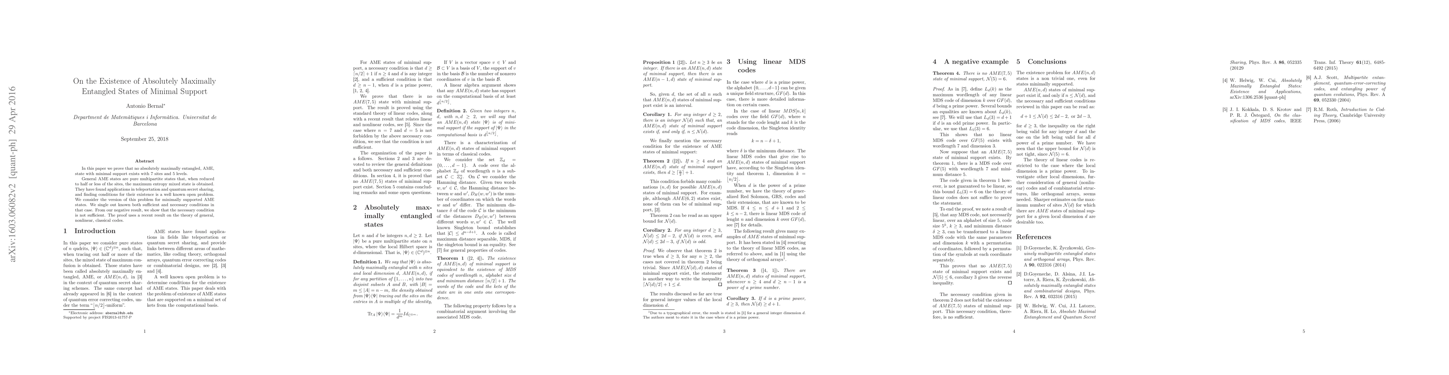 This paper proves that no absolutely maximally entangled state with minimal support exists for 7 sites and 5 levels. It highlights that while necessary conditions for such states exist, they are not sufficient, using insights from nonlinear classical codes.