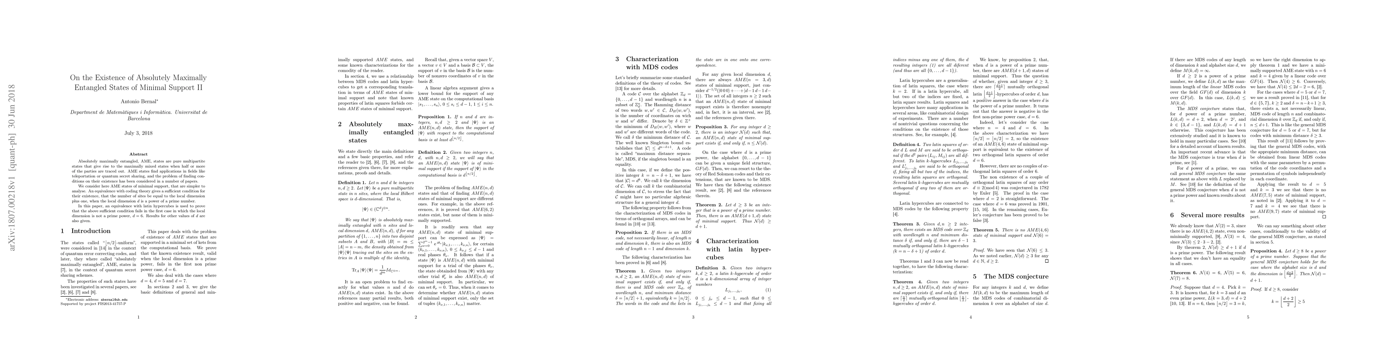 This paper investigates absolutely maximally entangled (AME) states of minimal support, which are pure multipartite states that yield maximally mixed states upon tracing out half or more parties. It establishes a sufficient condition for their existence based on an equivalence with coding theory, showing that it holds when the local dimension is a power of a prime number, but fails when the local dimension is not a prime power, as demonstrated in the case where $d=6$.