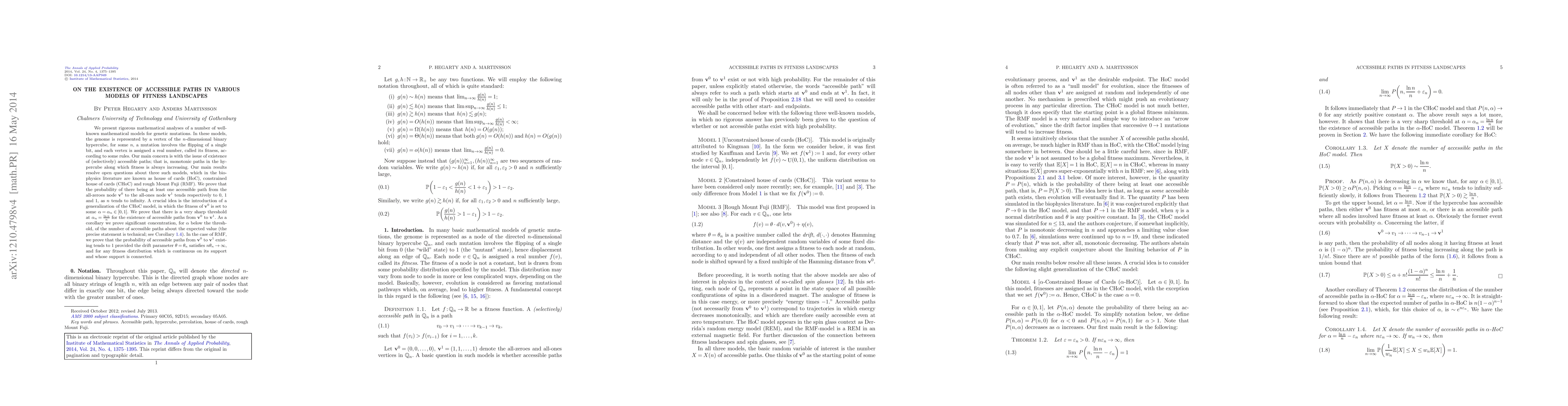 We present rigorous mathematical analyses of a number of well-known mathematical models for genetic mutations. In these models, the genome is represented by a vertex of the $n$-dimensional binary hypercube, for some $n$, a mutation involves the flipping of a single bit, and each vertex is assigned a real number, called its fitness, according to some rules. Our main concern is with the issue of existence of (selectively) accessible paths; that is, monotonic paths in the hypercube along which fitness is always increasing. Our main results resolve open questions about three such models, which in the biophysics literature are known as house of cards (HoC), constrained house of cards (CHoC) and rough Mount Fuji (RMF). We prove that the probability of there being at least one accessible path from the all-zeroes node $\mathbf {v}^0$ to the all-ones node $\mathbf {v}^1$ tends respectively to 0, 1 and 1, as $n$ tends to infinity. A crucial idea is the introduction of a generalization of the CHoC model, in which the fitness of $\mathbf {v}^0$ is set to some $\alpha=\alpha_n\in[0,1]$. We prove that there is a very sharp threshold at $\alpha_n=\frac{\ln n}{n}$ for the existence of accessible paths from $\mathbf {v}^0$ to $\mathbf {v}^1$. As a corollary we prove significant concentration, for $\alpha$ below the threshold, of the number of accessible paths about the expected value (the precise statement is technical; see Corollary 1.4). In the case of RMF, we prove that the probability of accessible paths from $\mathbf {v}^0$ to $\mathbf {v}^1$ existing tends to $1$ provided the drift parameter $\theta=\theta_n$ satisfies $n\theta_n\rightarrow\infty$, and for any fitness distribution which is continuous on its support and whose support is connected.