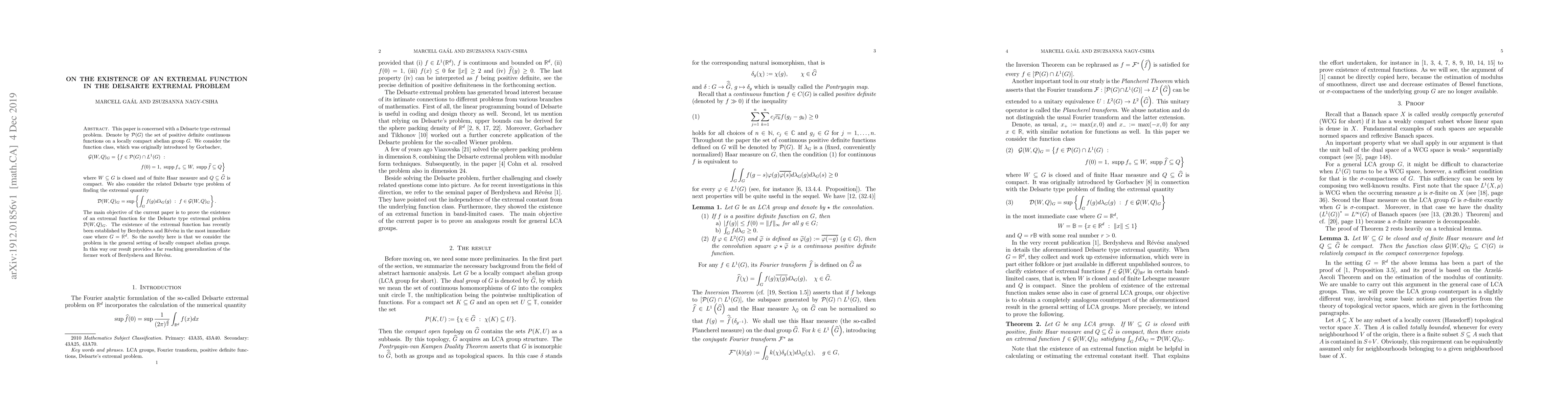 This paper is concerned with a Delsarte type extremal problem. Denote by $\mathcal{P}(G)$ the set of positive definite continuous functions on a locally compact abelian group $G$. We consider the function class, which was originally introduced by Gorbachev, \begin{multline*} \mathcal{G}(W, Q)_G = \left\{ f \in \mathcal{P}(G) \cap L^1(G) ~ : \right. ~ \left. f(0) = 1, ~ \text{supp}f_+ \subseteq W,~ \text{supp}\hat{f} \subseteq Q \right\} \end{multline*} where $W\subseteq G$ is closed and of finite Haar measure and $Q\subseteq \hat{G}$ is compact. We also consider the related Delsarte type problem of finding the extremal quantity \begin{equation*} \mathcal{D}(W,Q)_G = \sup \left\{ \int_{G} f(g) d\lambda_G(g) ~ : ~ f \in \mathcal{G}(W,Q)_G\right\}. \end{equation*} The main objective of the current paper is to prove the existence of an extremal function for the Delsarte type extremal problem $\mathcal{D}(W,Q)_G$. The existence of the extremal function has recently been established by Berdysheva and R\'ev\'esz in the most immediate case where $G=\mathbb{R}^d$. So the novelty here is that we consider the problem in the general setting of locally compact abelian groups. In this way our result provides a far reaching generalization of the former work of Berdysheva and R\'ev\'esz.