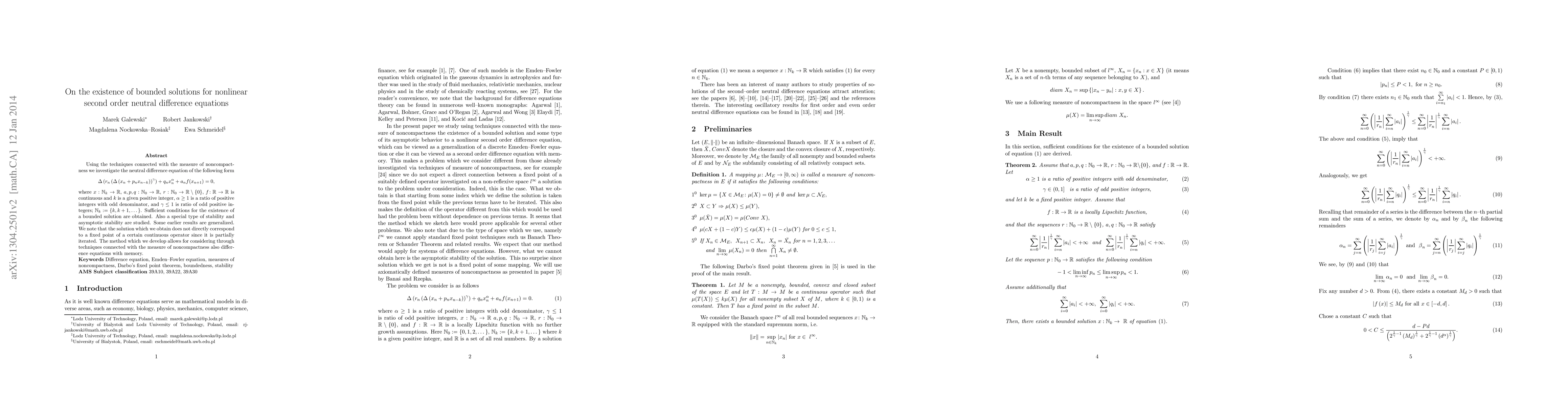 This paper explores the existence of bounded solutions for nonlinear second-order neutral difference equations using measures of noncompactness and Darbo's fixed point theorem. Sufficient conditions for bounded solutions and studies on stability are provided, generalizing earlier results.