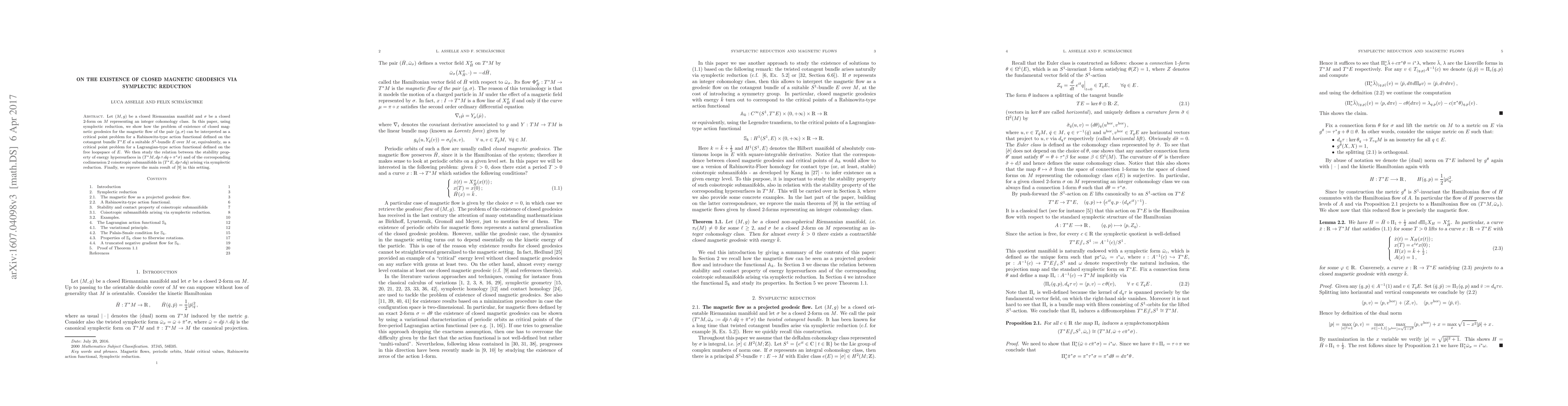 This paper uses symplectic reduction to investigate the existence of closed magnetic geodesics on a closed Riemannian manifold, framing the problem as a critical point issue for a Rabinowitz-type action functional. It also explores the relationship between the stability of energy hypersurfaces and corresponding coisotropic submanifolds.
