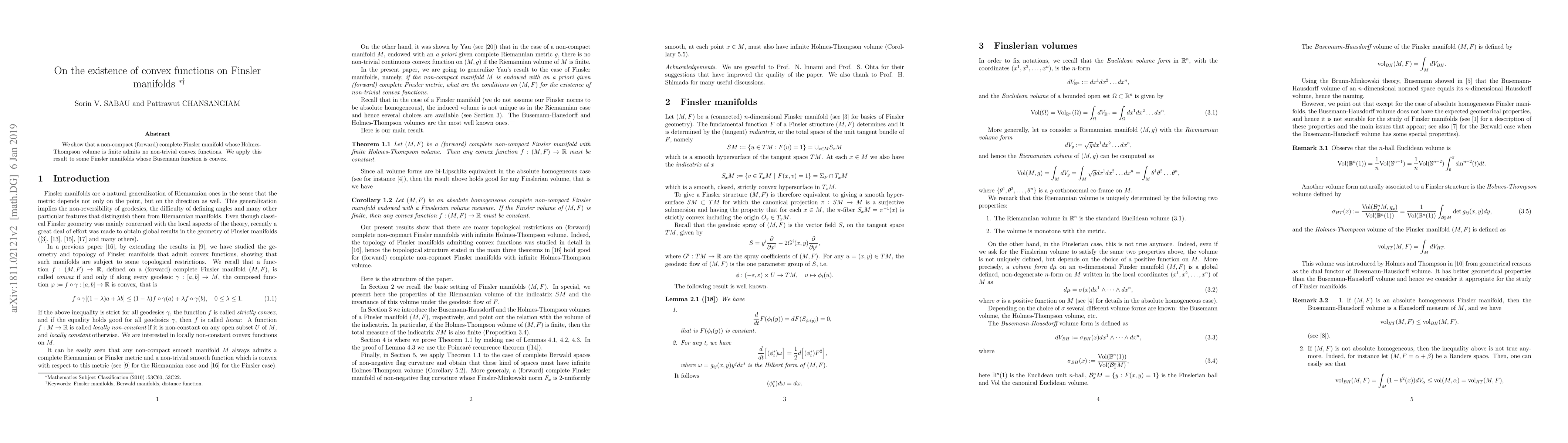 Summary: The paper demonstrates that non-compact, forward complete Finsler manifolds with infinite Holmes-Thompson volume cannot support non-trivial convex functions. This finding is applied to specific Finsler manifolds characterized by convex Busemann functions.