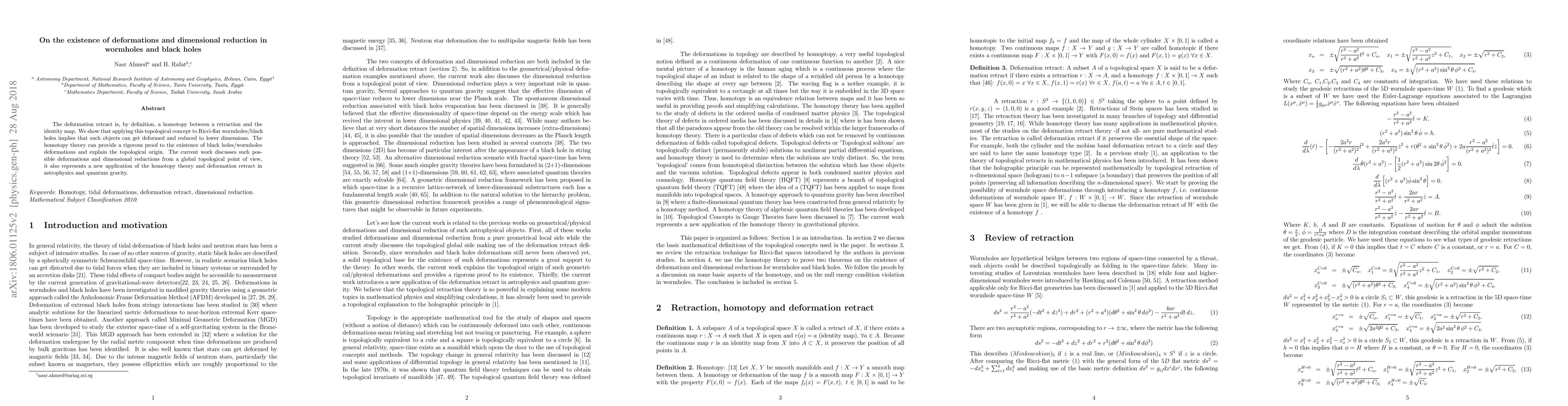 The deformation retract is, by definition, a homotopy between a retraction and the identity map. We show that applying this topological concept to Ricci-flat wormholes/black holes implies that such objects can get deformed and reduced to lower dimensions. The homotopy theory can provide a rigorous proof to the existence of black holes/wormholes deformations and explain the topological origin. The current work discusses such possible deformations and dimensional reductions from a global topological point of view, it also represents a new application of the homotopy theory and deformation retract in astrophysics and quantum gravity.