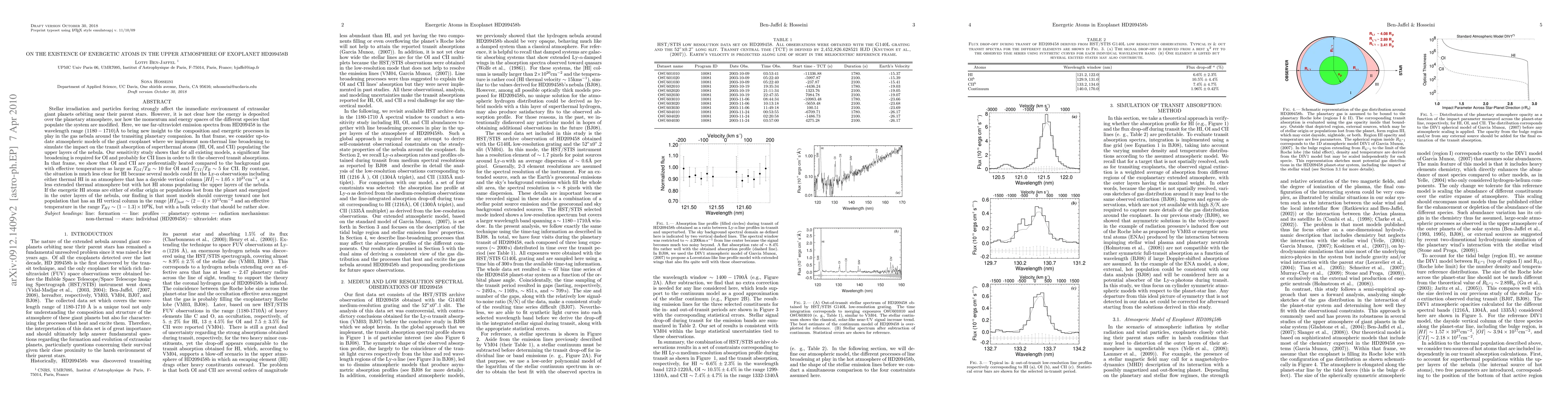 The study uses far-ultraviolet emission spectra from HD209458 to analyze the upper atmosphere of exoplanet HD209458b. It finds significant line broadening for oxygen (OI) and carbon (CII) atoms, indicating they are preferentially heated compared to the background gas. For hydrogen (HI), the results are less clear, with possibilities including thermal HI in a dense atmosphere or energetic HI atoms of stellar or planetary origin in the upper layers of the nebula. The research suggests that if energetic HI atoms exist, they would form a hot population with a specific vertical column density and temperature range.