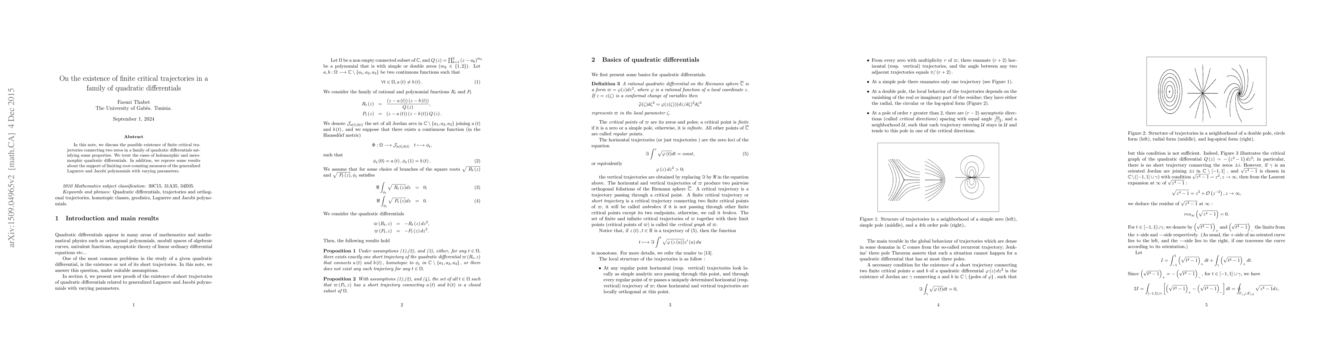 This paper explores the existence of finite critical trajectories in quadratic differentials, focusing on connections between zeros and presenting new proofs for the supports of limit measures of generalized Laguerre and Jacobi polynomials.