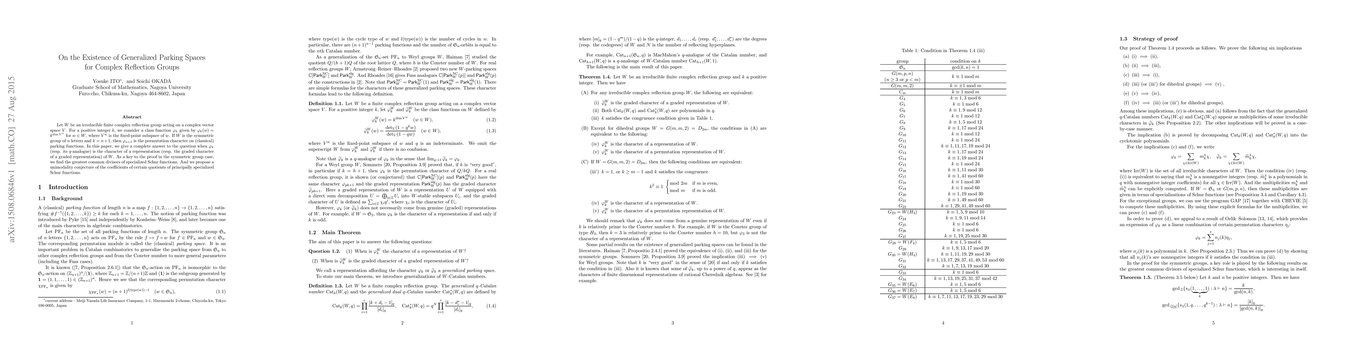 Let $W$ be an irreducible finite complex reflection group acting on a complex vector space $V$. For a positive integer $k$, we consider a class function $\varphi_k$ given by $\varphi_k(w) = k^{\dim V^w}$ for $w \in W$, where $V^w$ is the fixed-point subspace of $w$. If $W$ is the symmetric group of $n$ letters and $k=n+1$, then $\varphi_{n+1}$ is the permutation character on (classical) parking functions. In this paper, we give a complete answer to the question when $\varphi_k$ (resp. its $q$-analogue) is the character of a representation (resp. the graded character of a graded representation) of $W$. As a key to the proof in the symmetric group case, we find the greatest common divisors of specialized Schur functions. And we propose a unimodality conjecture of the coefficients of certain quotients of principally specialized Schur functions.