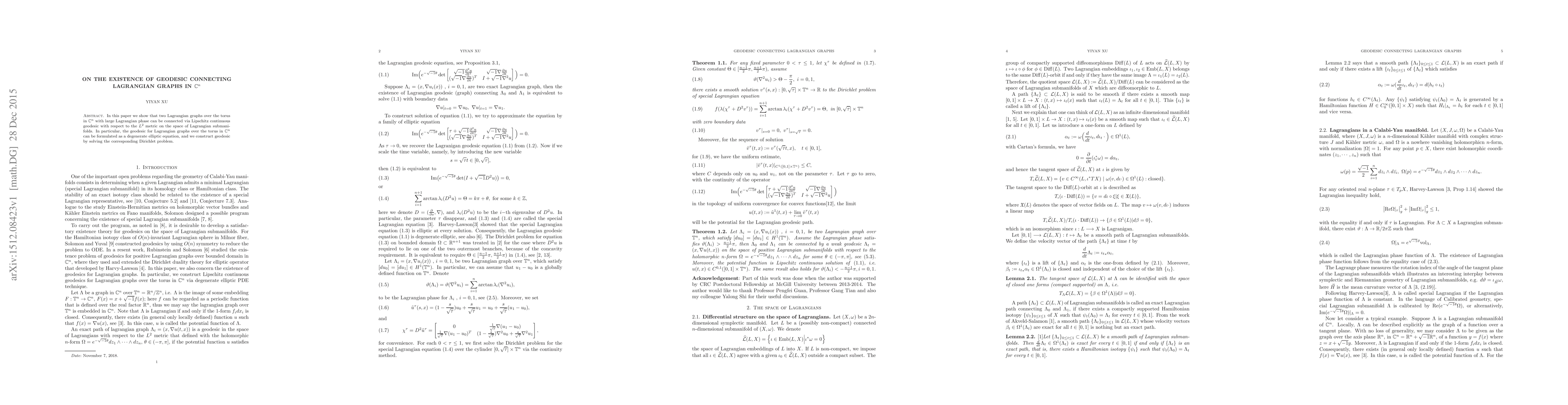 In this paper we show that two Lagrangian graphs over the torus in $\mathbb{C}^n$ with large Lagrangian phase can be connected via Lipschitz continuous geodesic with respect to the $L^2$ metric on the space of Lagrangian submanifolds. In particular, the geodesic for Lagrangian graphs over the torus in $\mathbb{C}^n$ can be formulated as a degenerate elliptic equation, and we construct geodesic by solving the corresponding Dirichlet problem.