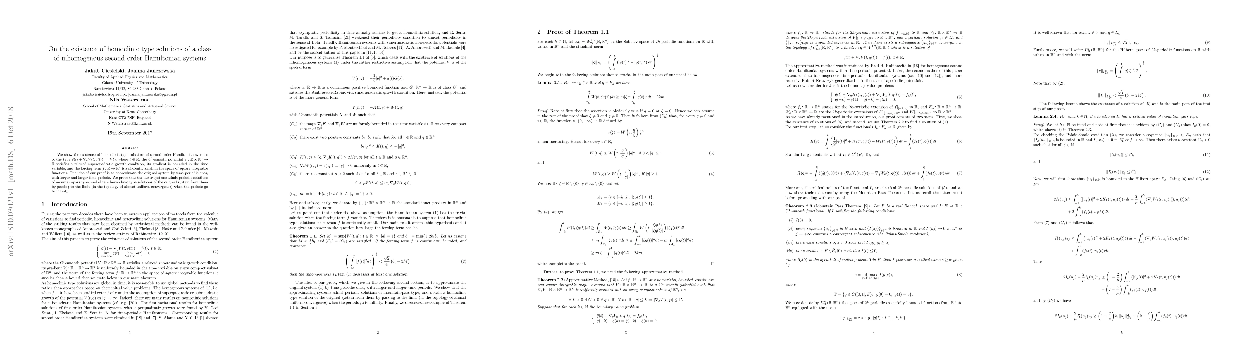 Summary: The paper demonstrates the existence of homoclinic type solutions in inhomogeneous second-order Hamiltonian systems with a relaxed superquadratic potential. The proof involves approximating the system with time-periodic versions and showing the convergence of periodic mountain-pass solutions to homoclinic solutions as the periods extend to infinity.