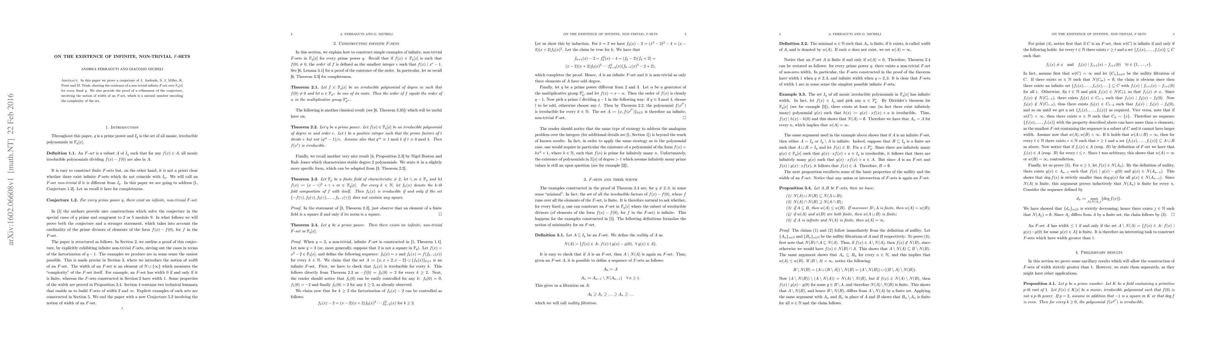 In this paper we prove a conjecture of J. Andrade, S. J. Miller, K. Pratt and M. Trinh, showing the existence of a non trivial infinite $F$-set over $\mathbb F_q[x]$ for every fixed $q$. We also provide the proof of a refinement of the conjecture, involving the notion of width of an $F$-set, which is a natural number encoding the complexity of the set.