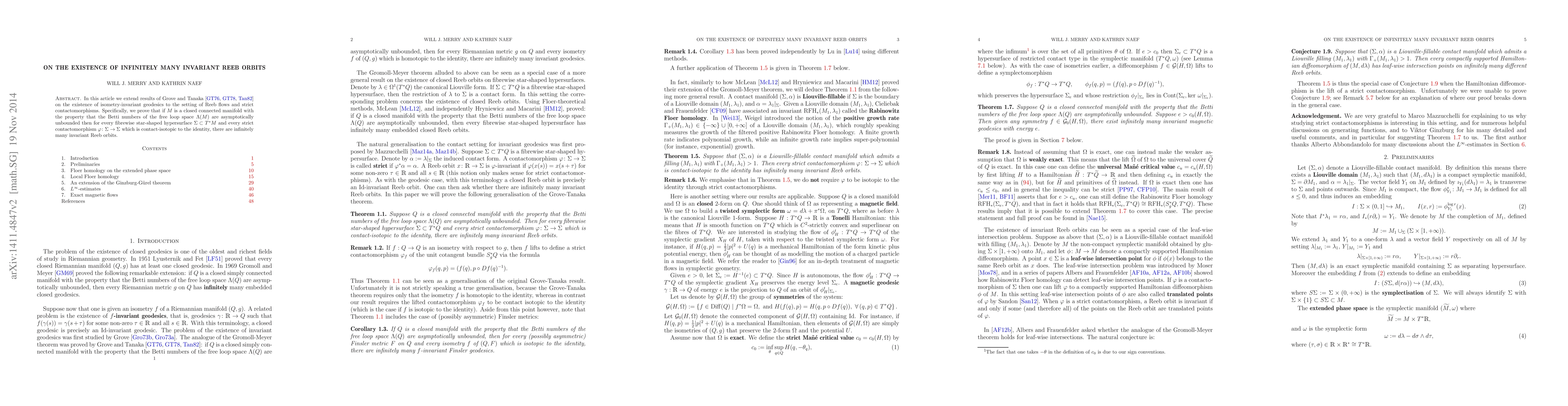 In this article we extend results of Grove and Tanaka on the existence of isometry-invariant geodesics to the setting of Reeb flows and strict contactomorphisms. Specifically, we prove that if M is a closed connected manifold with the property that the Betti numbers of the free loop space are asymptotically unbounded then for every fibrewise star-shaped hypersurface in the cotangent bundle of M and every strict contactomorphism of that hypersurface which is contact-isotopic to the identity, there are infinitely many invariant Reeb orbits.