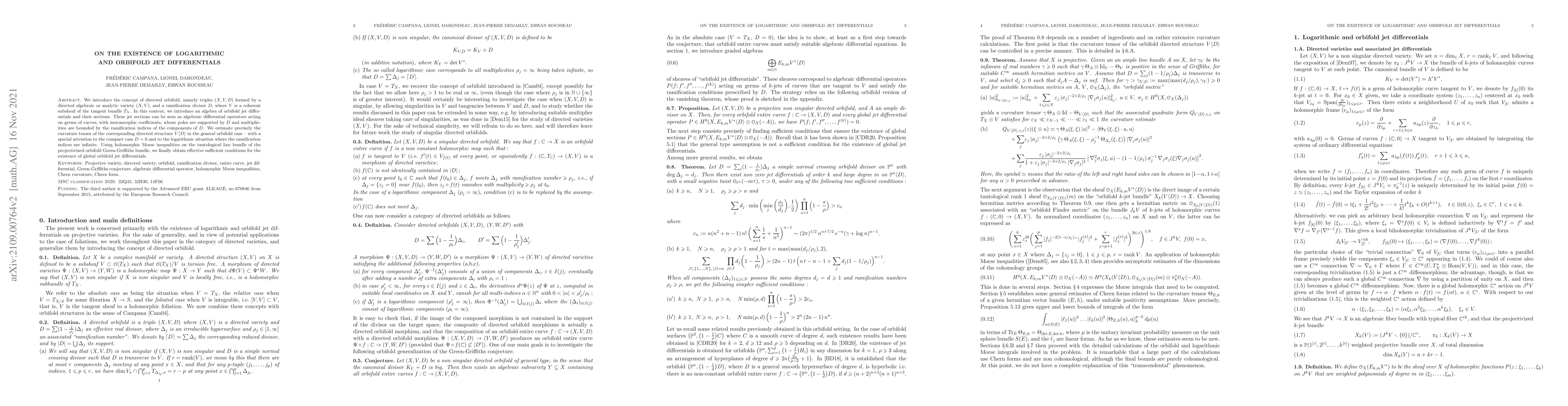 This paper introduces directed orbifolds and develops an algebra of orbifold jet differentials, analyzing their sections as algebraic differential operators. It provides precise estimates for the curvature tensor in the general orbifold case, with a focus on compact and logarithmic scenarios, and uses holomorphic Morse inequalities to establish conditions for the existence of global orbifold jet differentials.
