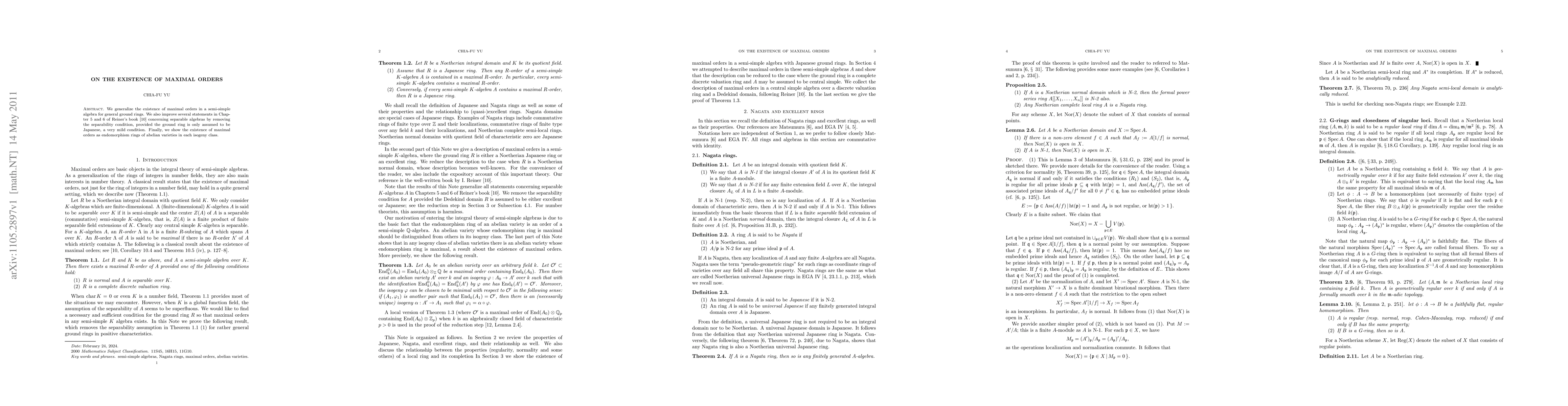 The paper presents a generalization of maximal order existence theorems, removing separability conditions for Japanese rings, and establishes a link between maximal orders and endomorphism rings of abelian varieties.