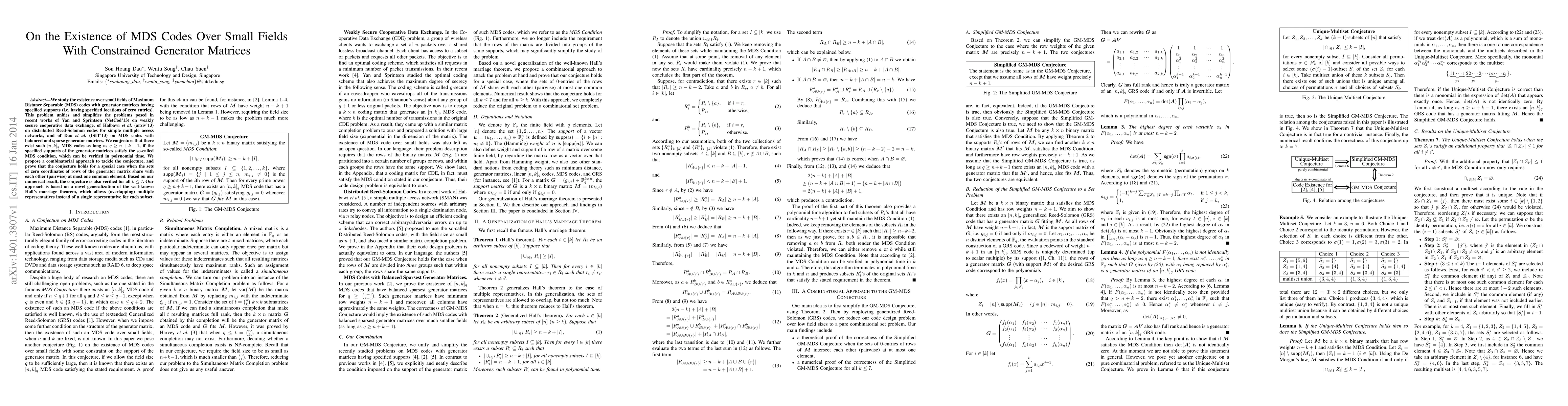 We study the existence over small fields of Maximum Distance Separable (MDS) codes with generator matrices having specified supports (i.e. having specified locations of zero entries). This problem unifies and simplifies the problems posed in recent works of Yan and Sprintson (NetCod'13) on weakly secure cooperative data exchange, of Halbawi et al. (arxiv'13) on distributed Reed-Solomon codes for simple multiple access networks, and of Dau et al. (ISIT'13) on MDS codes with balanced and sparse generator matrices. We conjecture that there exist such $[n,k]_q$ MDS codes as long as $q \geq n + k - 1$, if the specified supports of the generator matrices satisfy the so-called MDS condition, which can be verified in polynomial time. We propose a combinatorial approach to tackle the conjecture, and prove that the conjecture holds for a special case when the sets of zero coordinates of rows of the generator matrix share with each other (pairwise) at most one common element. Based on our numerical result, the conjecture is also verified for all $k \leq 7$. Our approach is based on a novel generalization of the well-known Hall's marriage theorem, which allows (overlapping) multiple representatives instead of a single representative for each subset.