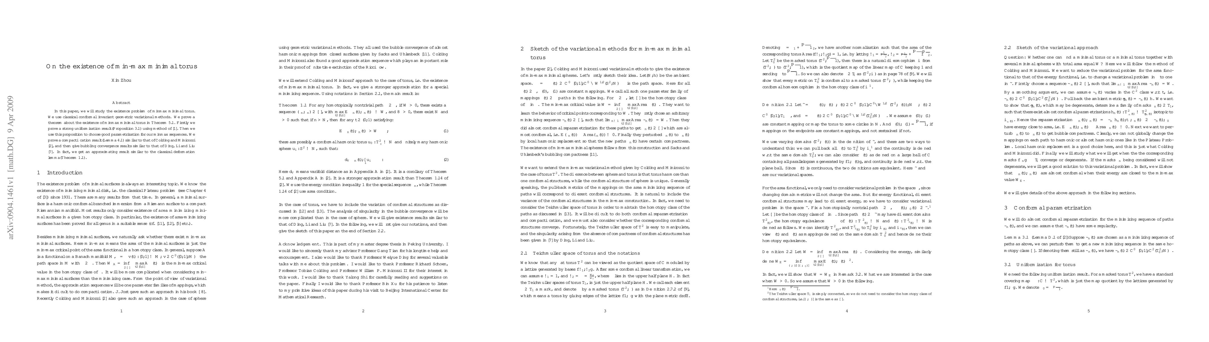 This paper explores the existence of min-max minimal torus utilizing classical conformal invariant geometric variational methods. It proves Theorem 5.1 on the existence of such tori, leveraging a strong uniformization result and compactification techniques, followed by bubbling convergence results.