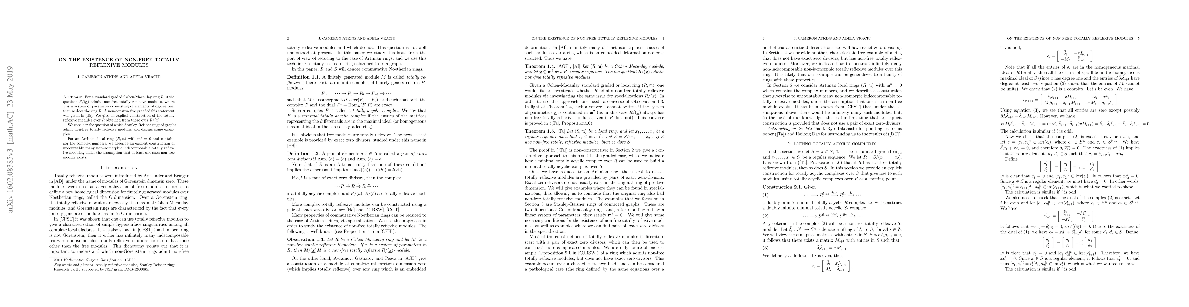 For a standard graded Cohen-Macaulay ring $S$, if the quotient $S/(\underline{x})$ admits non-free totally reflexive modules, where $\underline{x}$ is a system of parameters consisting of elements of degree one, then so does the ring $S$. As an application, we consider the question of which Stanley-Reisner rings of graphs admit non-free totally reflexive modules.