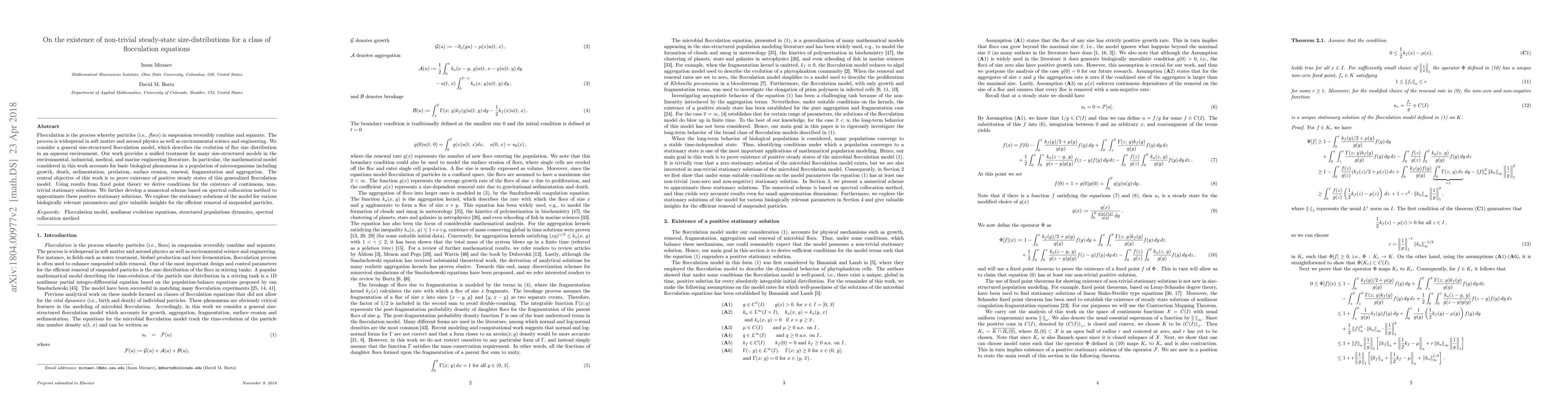 This paper explores the existence of non-trivial steady-state size-distributions for a generalized flocculation model that incorporates various biological phenomena. It proves the existence of continuous, non-trivial stationary solutions using fixed point theory and develops a spectral collocation method for numerical approximation.