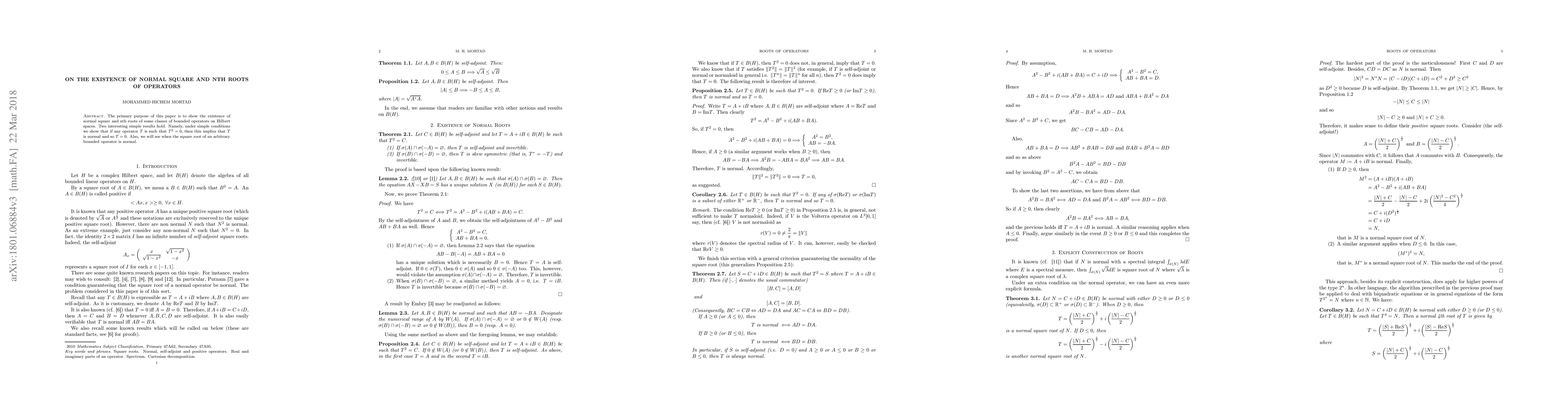 The primary purpose of this paper is to show the existence of normal square and nth roots of some classes of bounded operators on Hilbert spaces. Two interesting simple results hold. Namely, under simple conditions we show that if any operator $T$ is such that $T^2=0$, then this implies that $T$ is normal and so $T=0$. Also, we will see when the square root of an arbitrary bounded operator is normal.