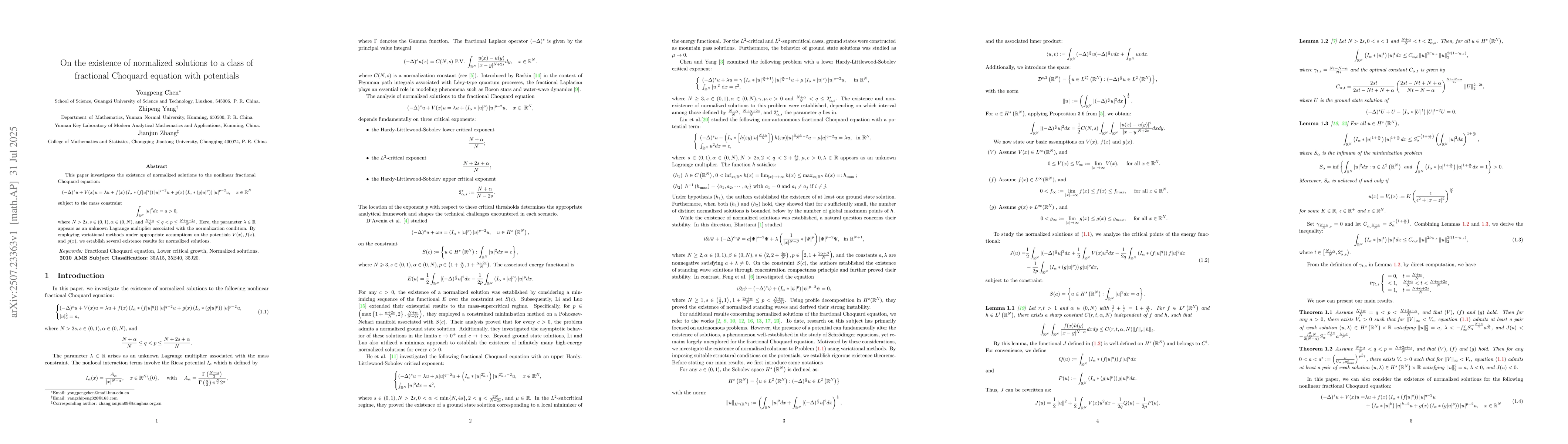 This paper investigates the existence of normalized solutions to the nonlinear fractional Choquard equation: $$ (-\Delta)^s u+V(x) u=\lambda u+f(x)\left(I_\alpha *\left(f|u|^q\right)\right)|u|^{q-2} u+g(x)\left(I_\alpha *\left(g|u|^p\right)\right)|u|^{p-2} u, \quad x \in \mathbb{R}^N $$ subject to the mass constraint $$ \int_{\mathbb{R}^N}|u|^2 d x=a>0, $$ where $N>2 s, s \in(0,1), \alpha \in(0, N)$, and $\frac{N+\alpha}{N} \leq q