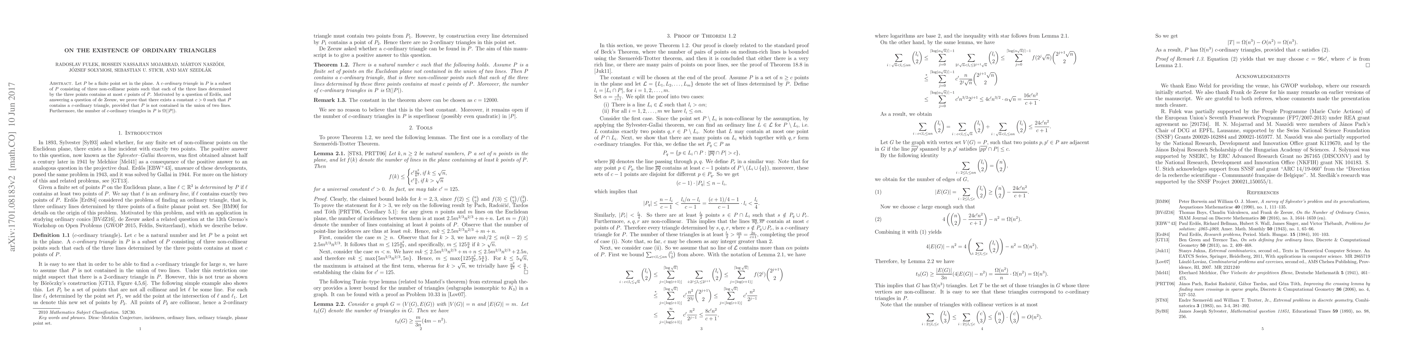 Let $P$ be a finite point set in the plane. A \emph{$c$-ordinary triangle} in $P$ is a subset of $P$ consisting of three non-collinear points such that each of the three lines determined by the three points contains at most $c$ points of $P$. Motivated by a question of Erd\H{o}s, and answering a question of de Zeeuw, we prove that there exists a constant $c>0$ such that $P$ contains a $c$-ordinary triangle, provided that $P$ is not contained in the union of two lines. Furthermore, the number of $c$-ordinary triangles in $P$ is $\Omega(|P|)$.