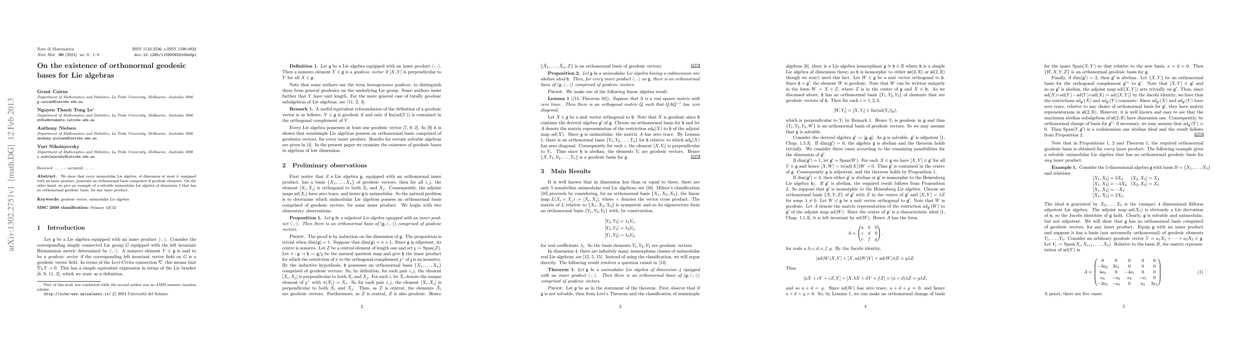 We show that every unimodular Lie algebra, of dimension at most 4, equipped with an inner product, possesses an orthonormal basis comprised of geodesic elements. On the other hand, we give an example of a solvable unimodular Lie algebra of dimension 5 that has no orthonormal geodesic basis, for any inner product.