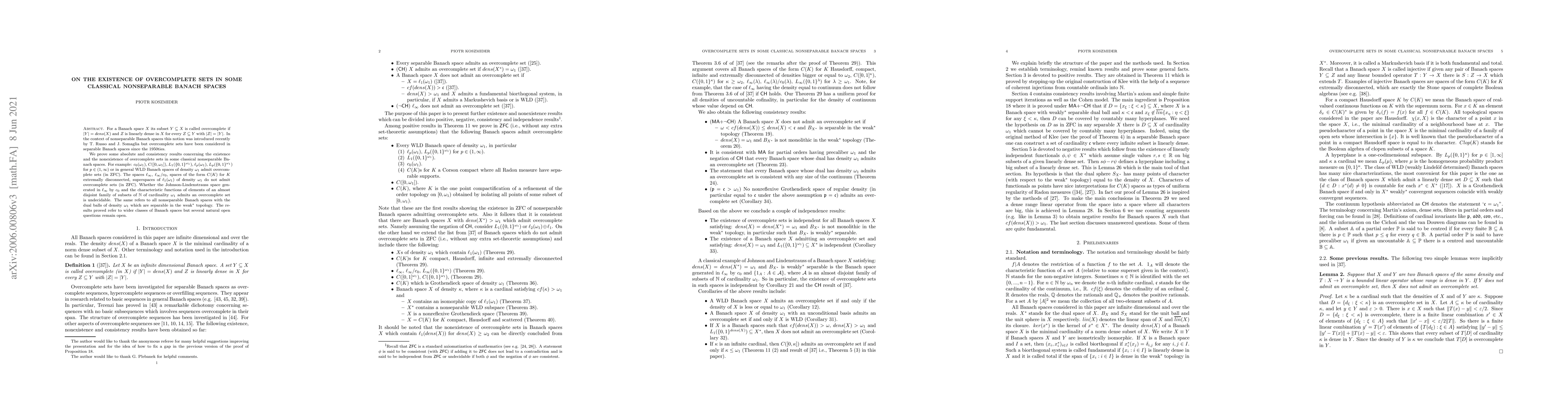 This paper investigates the existence of overcomplete sets in several classical nonseparable Banach spaces. It establishes that certain spaces like $c_0(\omega_1)$ and $L_p(\{0,1\}^{\omega_1})$ admit overcomplete sets, while others like $\ell_\infty$ and $C(K)$ for extremally disconnected $K$ do not. The results remain inconclusive for specific constructed spaces and broader classes.