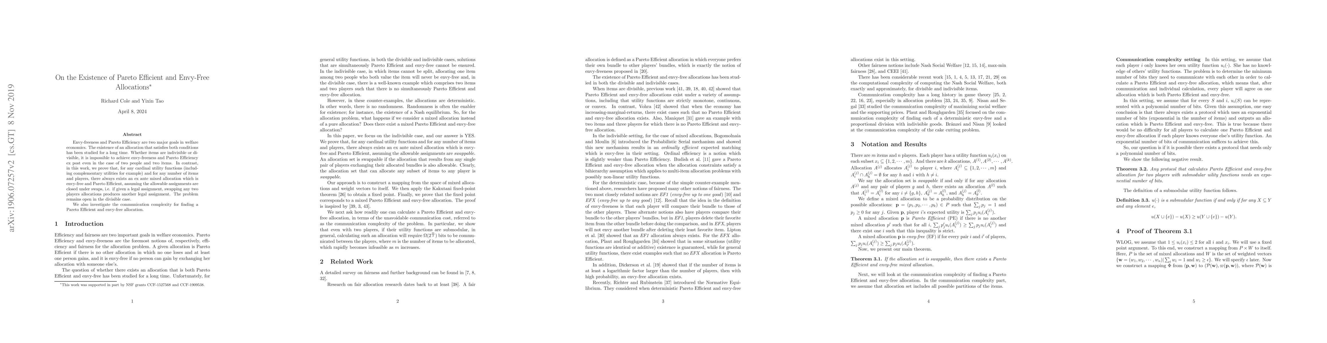 This paper proves the existence of an ex ante mixed allocation that is both envy-free and Pareto Efficient for any cardinal utility functions and number of items/players, provided assignments are closed under swaps. The study also explores the communication complexity for achieving such allocations, while the problem remains unresolved in the divisible case.