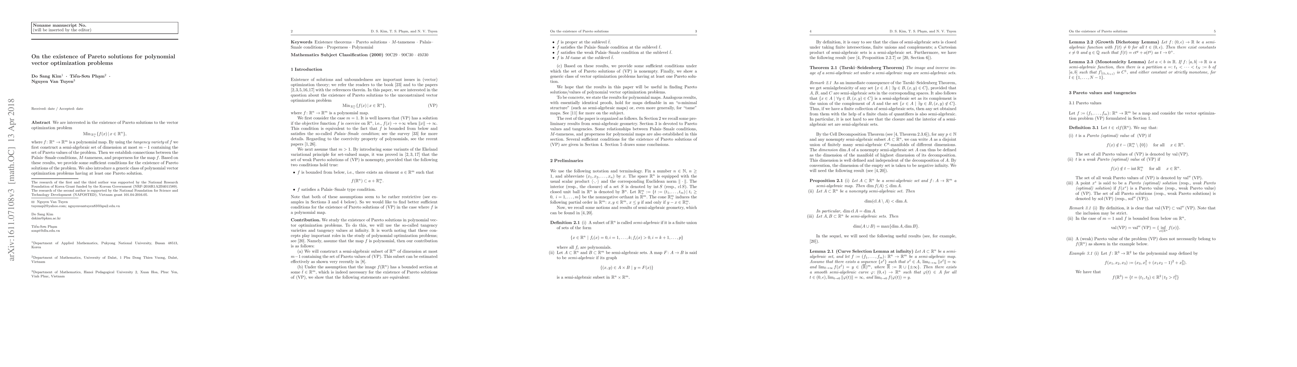 This paper investigates the existence of Pareto solutions for polynomial vector optimization problems, constructing a semi-algebraic set containing these solutions using the tangency variety. It establishes connections between various conditions and provides sufficient conditions for the existence of Pareto solutions, introducing a generic class of problems with guaranteed Pareto solutions.