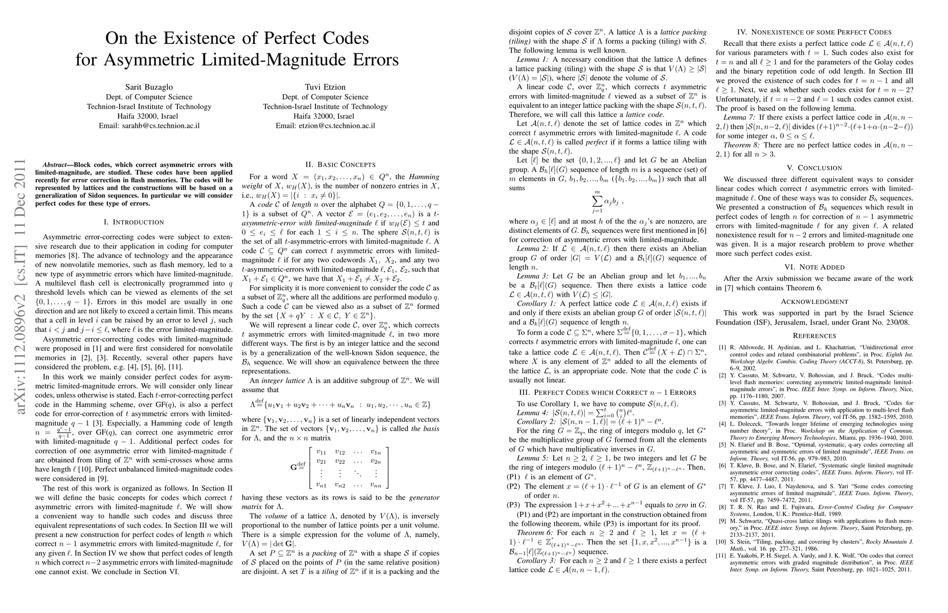 This paper investigates block codes that correct asymmetric errors with limited magnitude, focusing on their application in flash memory error correction. The study constructs these codes using lattices and generalizes Sidon sequences to explore the existence of perfect codes for such error types.