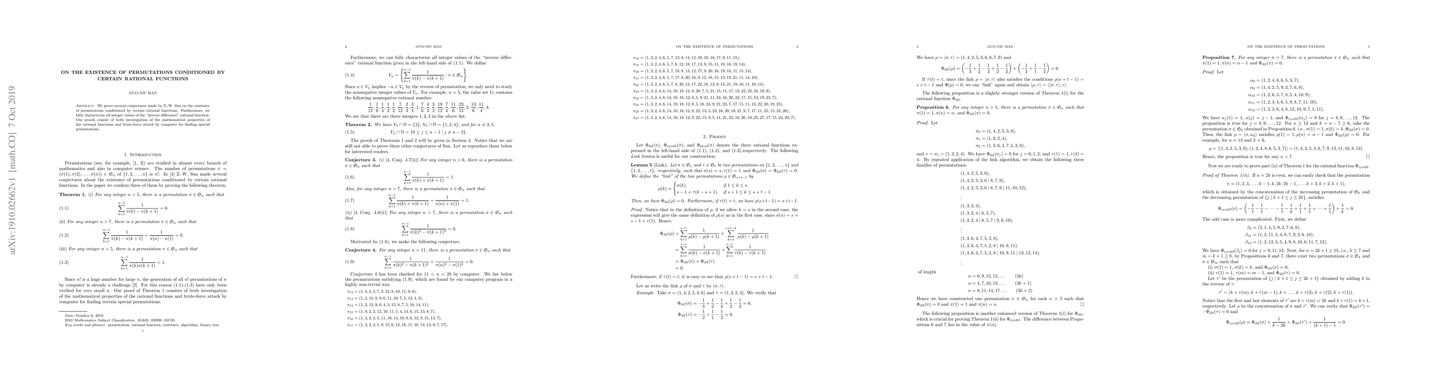 We prove several conjectures made by Z.-W. Sun on the existence of permutations conditioned by certain rational functions. Furthermore, we fully characterize all integer values of the "inverse difference" rational function. Our proofs consist of both investigation of the mathematical properties of the rational functions and brute-force attack by computer for finding special permutations.