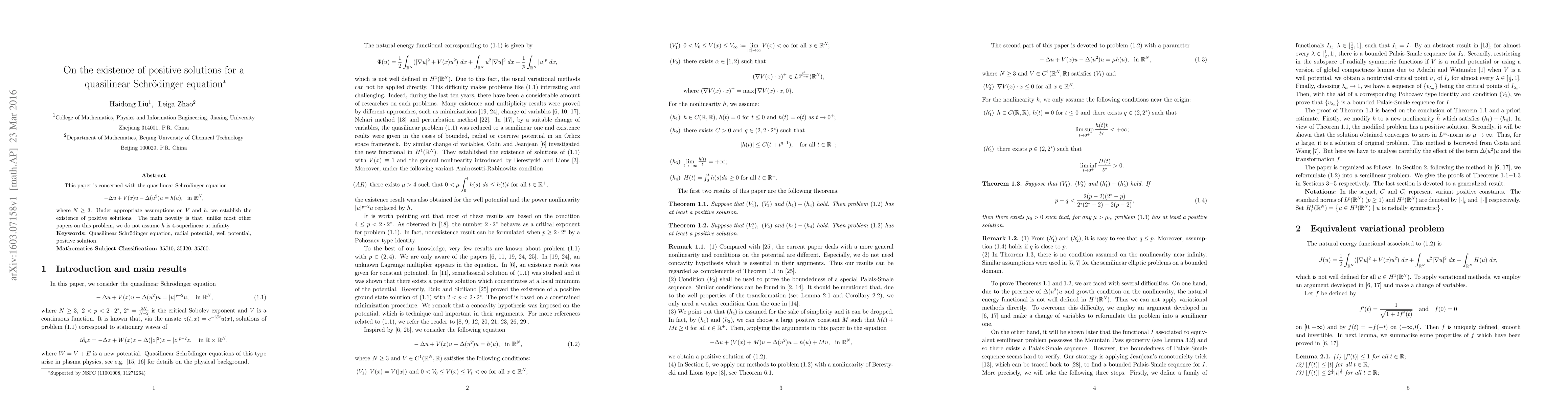 This paper establishes the existence of positive solutions for the quasilinear Schrödinger equation without the usual 4-superlinearity assumption on $h$ at infinity, under suitable conditions on $V$ and $h$. The main novelty lies in relaxing the typical superlinearity requirement.