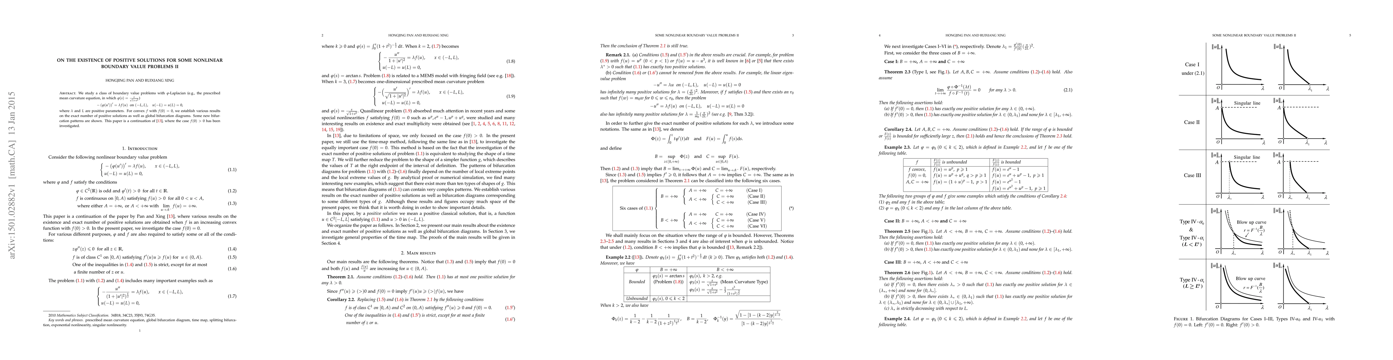 We study a class of boundary value problems with $\varphi$-Laplacian (e.g., the prescribed mean curvature equation, in which $\varphi(s)=\frac{s}{\sqrt{1+s^2}}$) \begin{center} $-\left(\varphi(u')\right)'=\lambda f(u)\; \text{ on }(-L, L),\quad u(-L)=u(L)=0,$ \end{center} where $\lambda$ and $L$ are positive parameters. For convex $f$ with $f(0)=0$, we establish various results on the exact number of positive solutions as well as global bifurcation diagrams. Some new bifurcation patterns are shown. This paper is a continuation of Pan and Xing [13], where the case $f(0)>0$ has been investigated.