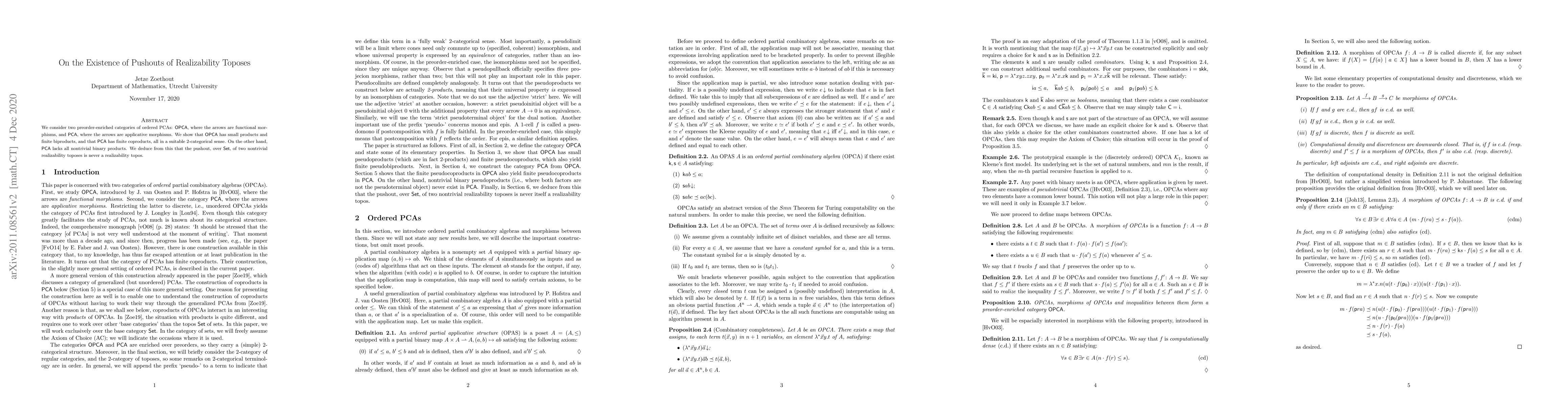 We consider two preorder-enriched categories of ordered PCAs: $\mathsf{OPCA}$, where the arrows are functional morphisms, and $\mathsf{PCA}$, where the arrows are applicative morphisms. We show that $\mathsf{OPCA}$ has small products and finite biproducts, and that $\mathsf{PCA}$ has finite coproducts, all in a suitable 2-categorical sense. On the other hand, $\mathsf{PCA}$ lacks all nontrivial binary products. We deduce from this that the pushout, over $\mathsf{Set}$, of two nontrivial realizability toposes is never a realizability topos.