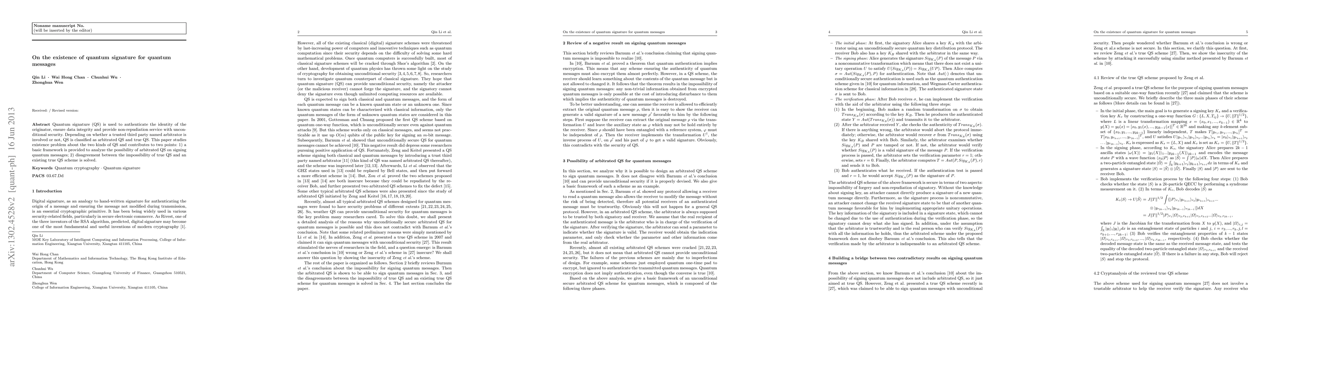 Quantum signature (QS) is used to authenticate the identity of the originator, ensure data integrity and provide non-repudiation service with unconditional security. Depending on whether a trusted third party named arbitrator is involved or not, QS is classified as arbitrated QS and true QS. This paper studies existence problem about the two kinds of QS and contributes to two points: 1) a basic framework is provided to analyze the possibility of arbitrated QS on signing quantum messages; 2) disagreement between the impossibility of true QS and an existing true QS scheme is solved.