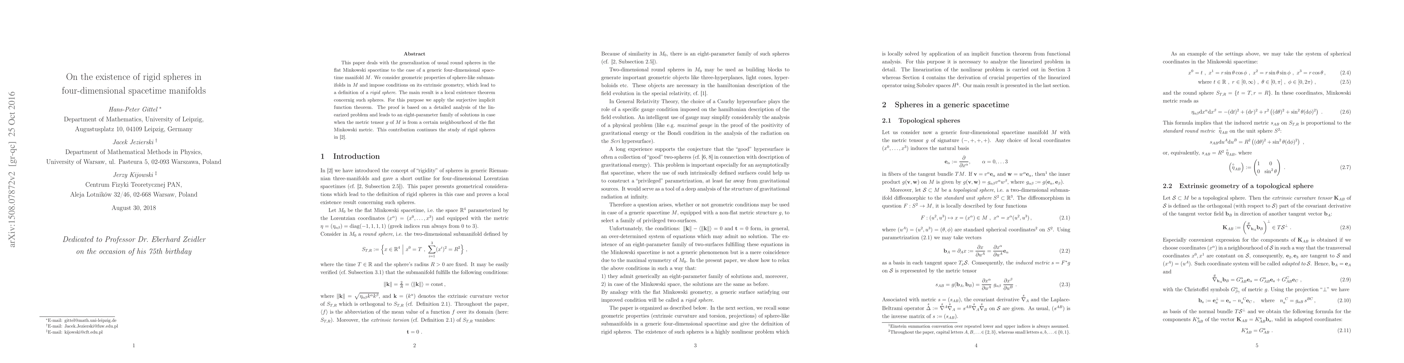 This paper generalizes the concept of rigid spheres from flat Minkowski spacetime to arbitrary four-dimensional spacetime manifolds, establishing conditions for their existence and proving a local existence theorem. The proof utilizes the surjective implicit function theorem and reveals an eight-parameter family of solutions when the metric tensor is close to the flat Minkowski metric.