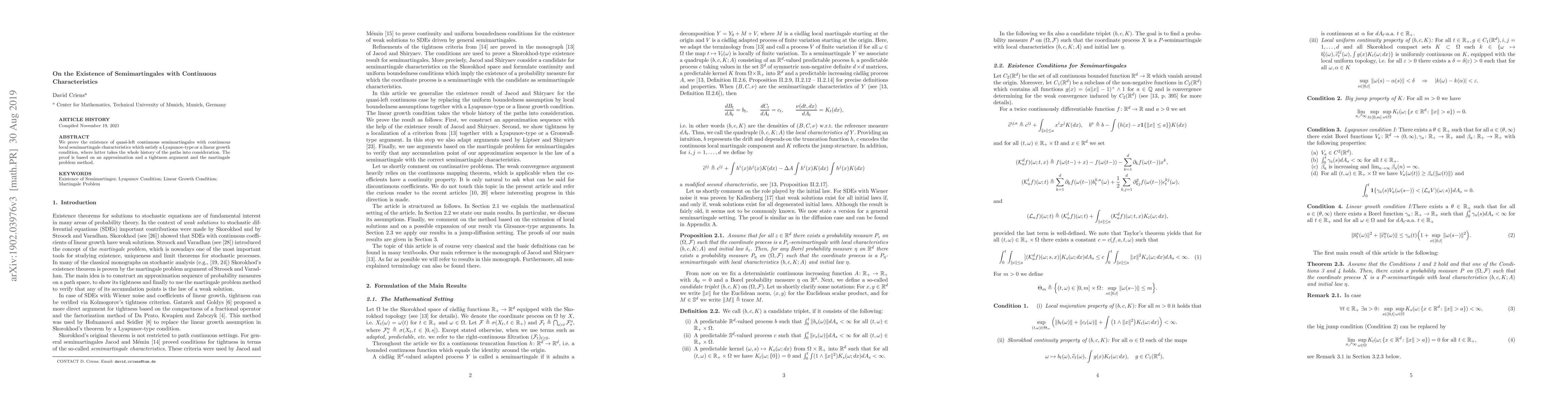 Researchers prove the existence of semimartingales with continuous characteristics that satisfy certain conditions, expanding our understanding of stochastic processes.