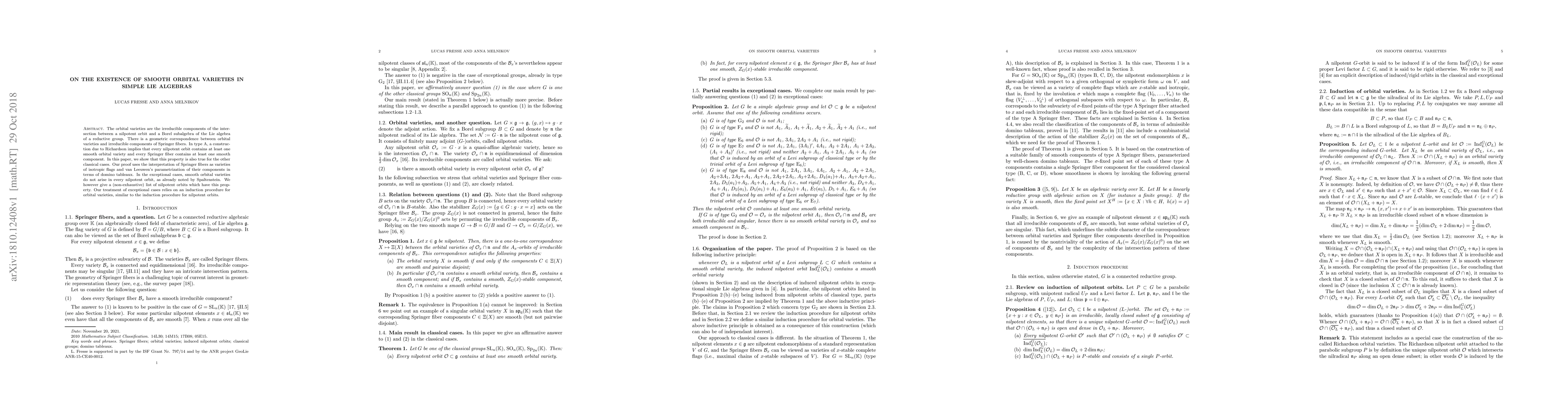 The orbital varieties are the irreducible components of the intersection between a nilpotent orbit and a Borel subalgebra of the Lie algebra of a reductive group. There is a geometric correspondence between orbital varieties and irreducible components of Springer fibers. In type A, a construction due to Richardson implies that every nilpotent orbit contains at least one smooth orbital variety and every Springer fiber contains at least one smooth component. In this paper, we show that this property is also true for the other classical cases. Our proof uses the interpretation of Springer fibers as varieties of isotropic flags and van Leeuwen's parametrization of their components in terms of domino tableaux. In the exceptional cases, smooth orbital varieties do not arise in every nilpotent orbit, as already noted by Spaltenstein. We however give a (non-exhaustive) list of nilpotent orbits which have this property. Our treatment of exceptional cases relies on an induction procedure for orbital varieties, similar to the induction procedure for nilpotent orbits.