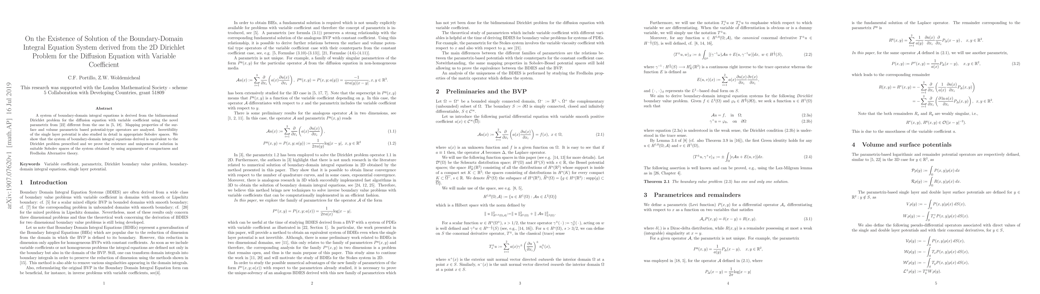 A system of boundary-domain integral equations is derived from the bidimensional Dirichlet problem for the diffusion equation with variable coefficient using the novel parametrix from [22] different from the one in [5,18]. Mapping properties of the surface and volume parametrix based potential-type operators are analysed. Invertibility of the single layer potential is also studied in detail in appropriate Sobolev spaces. We show that the system of boundary-domain integral equations derived is equivalent to the Dirichlet problem prescribed and we prove the existence and uniqueness of solution in suitable Sobolev spaces of the system obtained by using arguments of compactness and Fredholm Alternative theory.