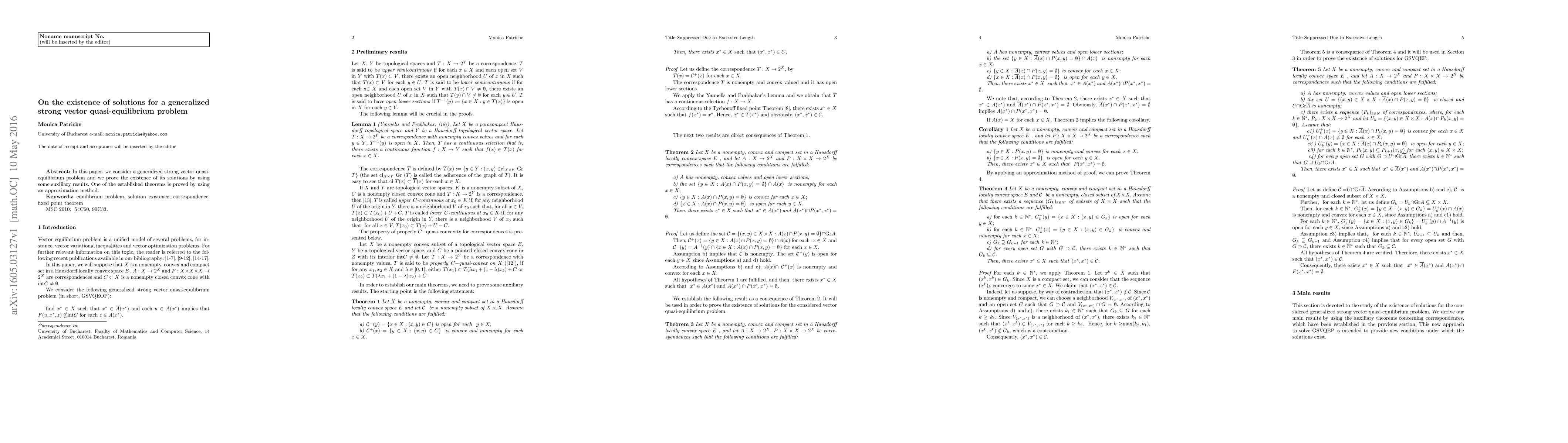 Summary: This paper investigates the existence of solutions for a generalized strong vector quasi-equilibrium problem, proving their existence through auxiliary results and employing an approximation method to establish a key theorem.