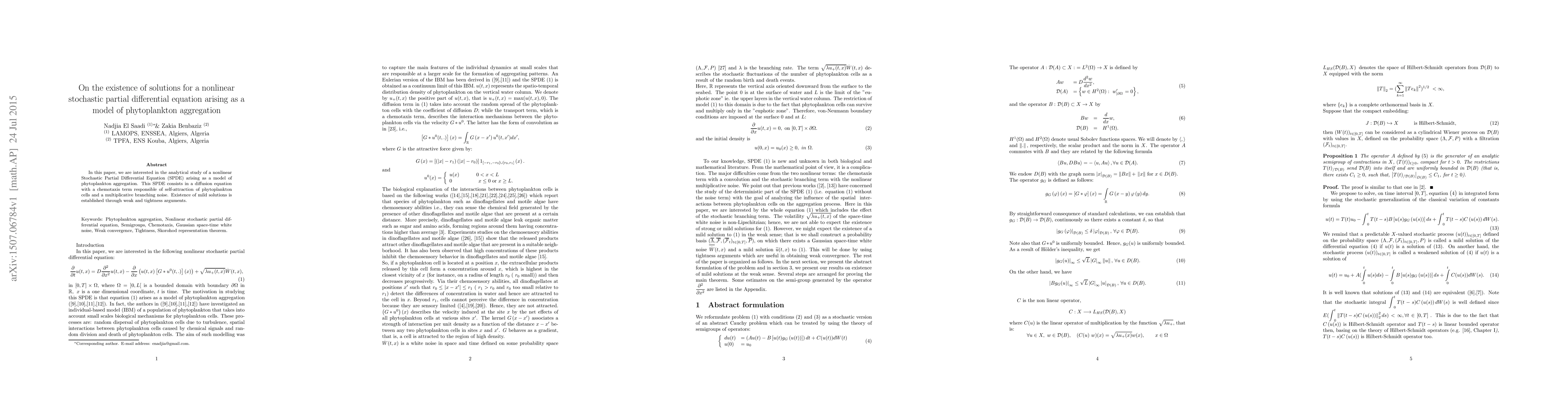 In this paper, we are interested in the analytical study of a nonlinear Stochastic Partial Differential Equation (SPDE) arising as a model of phytoplankton aggregation. This SPDE consists in a diffusion equation with a chemotaxis term responsible of self-attraction of phytoplankton cells and a multiplicative branching noise. Existence of mild solutions is established through weak and tightness arguments.